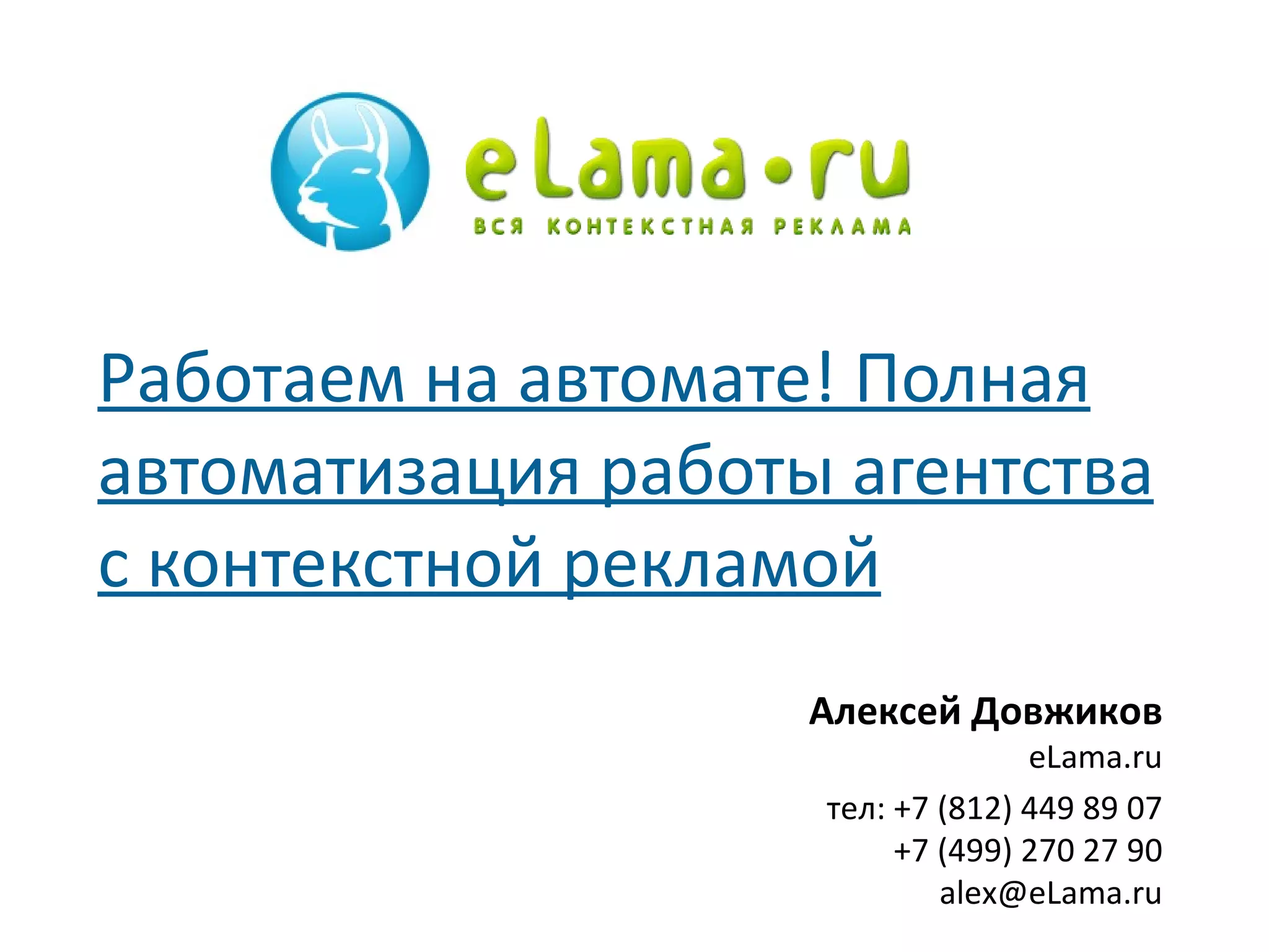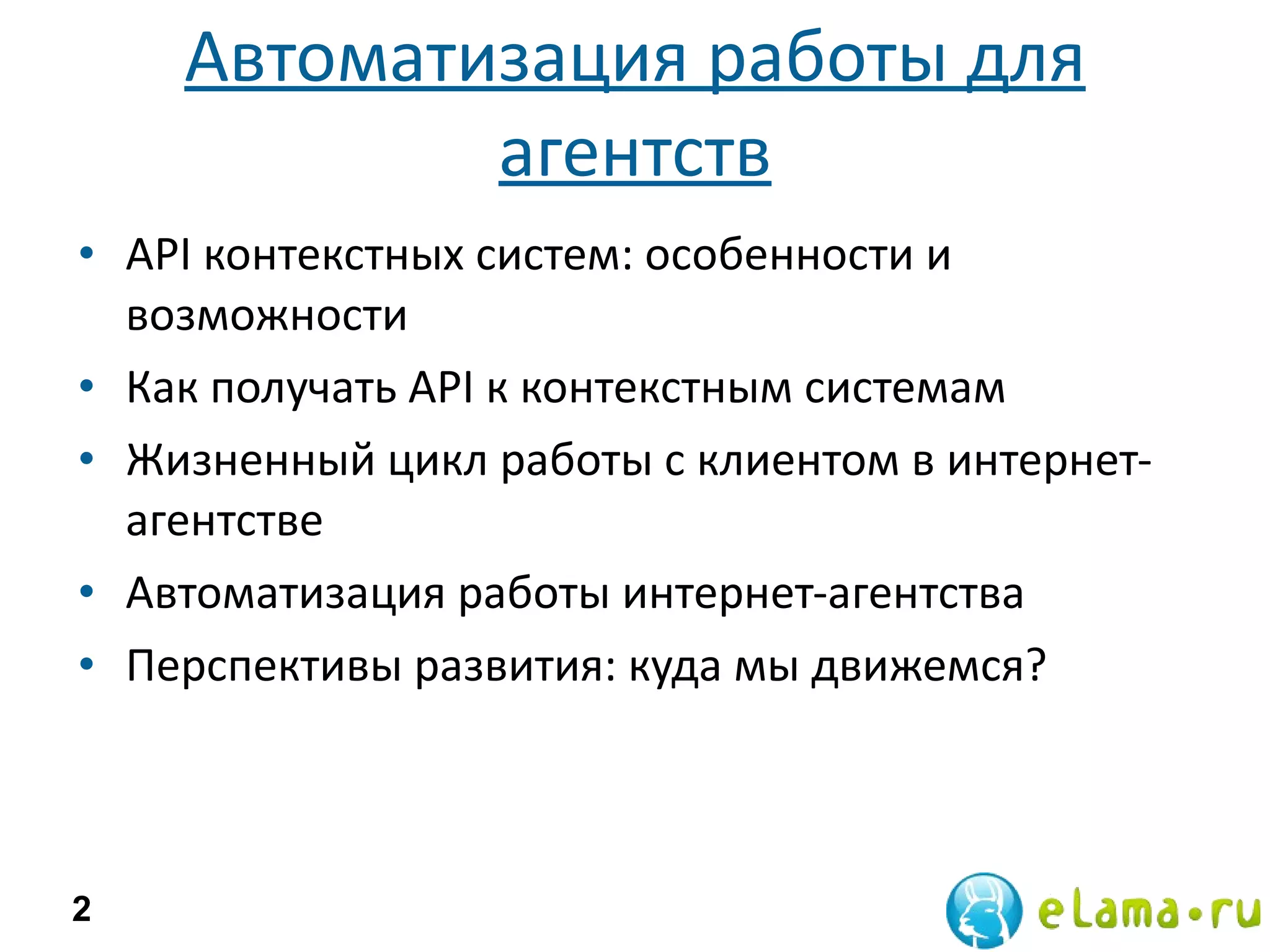 Документ обсуждает автоматизацию работы интернет-агентств с контекстной рекламой, включая использование различных API, таких как Яндекс.Директ, Бегун и Google AdWords. Он детализирует жизненный цикл работы с клиентом, автоматизацию процессов продажи, создания кампаний и управления рекламными системами. Описываются перспективы развития агентств и предлагаются рекомендации по оптимизации работы с контекстной рекламой.