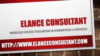 Elance Consultant provides research assistance, freelance consultancy, and custom data science solutions in economics, finance, and related fields. Their services include training for effective writing, project planning, and adherence to quality standards based on ISO certifications. They focus on client satisfaction through clear proposals, measurable goals, and post-completion support.