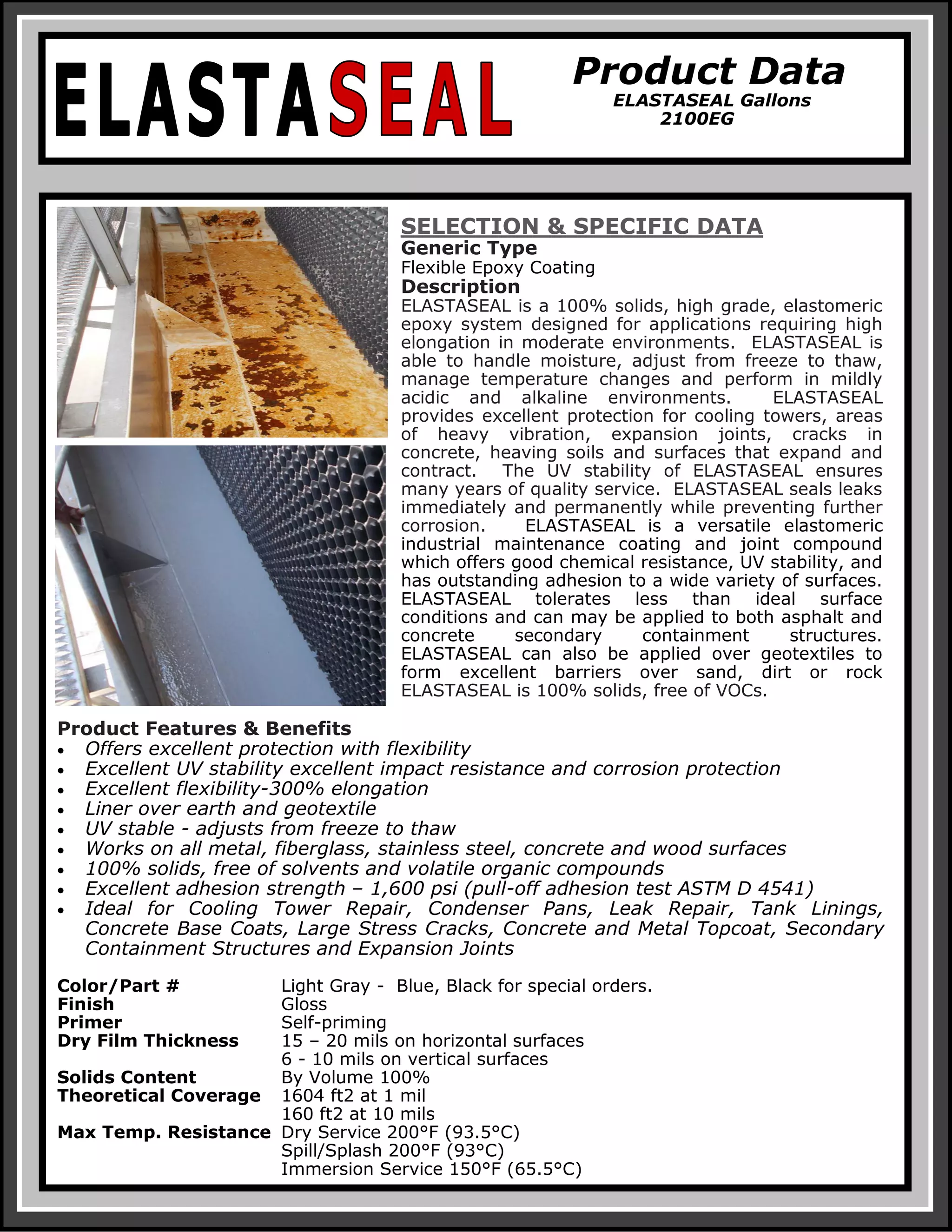 This document summarizes the properties and application of ELASTASEAL, a flexible epoxy coating designed for applications requiring high elongation. ELASTASEAL can tolerate expansion and contraction, adjusts to freeze-thaw cycles, and provides corrosion protection for surfaces like cooling towers, expansion joints, and concrete. It is a 100% solids, solvent-free coating that offers excellent adhesion and flexibility with elongation up to 300%. ELASTASEAL can be applied to surfaces like metal, concrete, wood, and geotextiles, and is suitable for uses like tank linings, secondary containment, and crack repair.