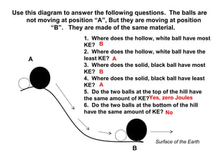 The document contains a diagram showing two balls, one hollow and white and one solid and black, at positions A and B on a hill. It asks 6 multiple choice questions about the kinetic energy of the balls at different positions. The questions can be answered by considering that kinetic energy depends on mass and speed, and the balls will have more kinetic energy rolling downhill at position B than uphill at position A.