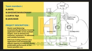 The document outlines a project focused on elastic load balancing and AWS auto scaling, which distribute application traffic across various targets to ensure efficient performance. It details methods like instance creation, target groups, and autoscaling launch configurations. The expected outcomes include improved performance through auto scaling and load balancing for applications.