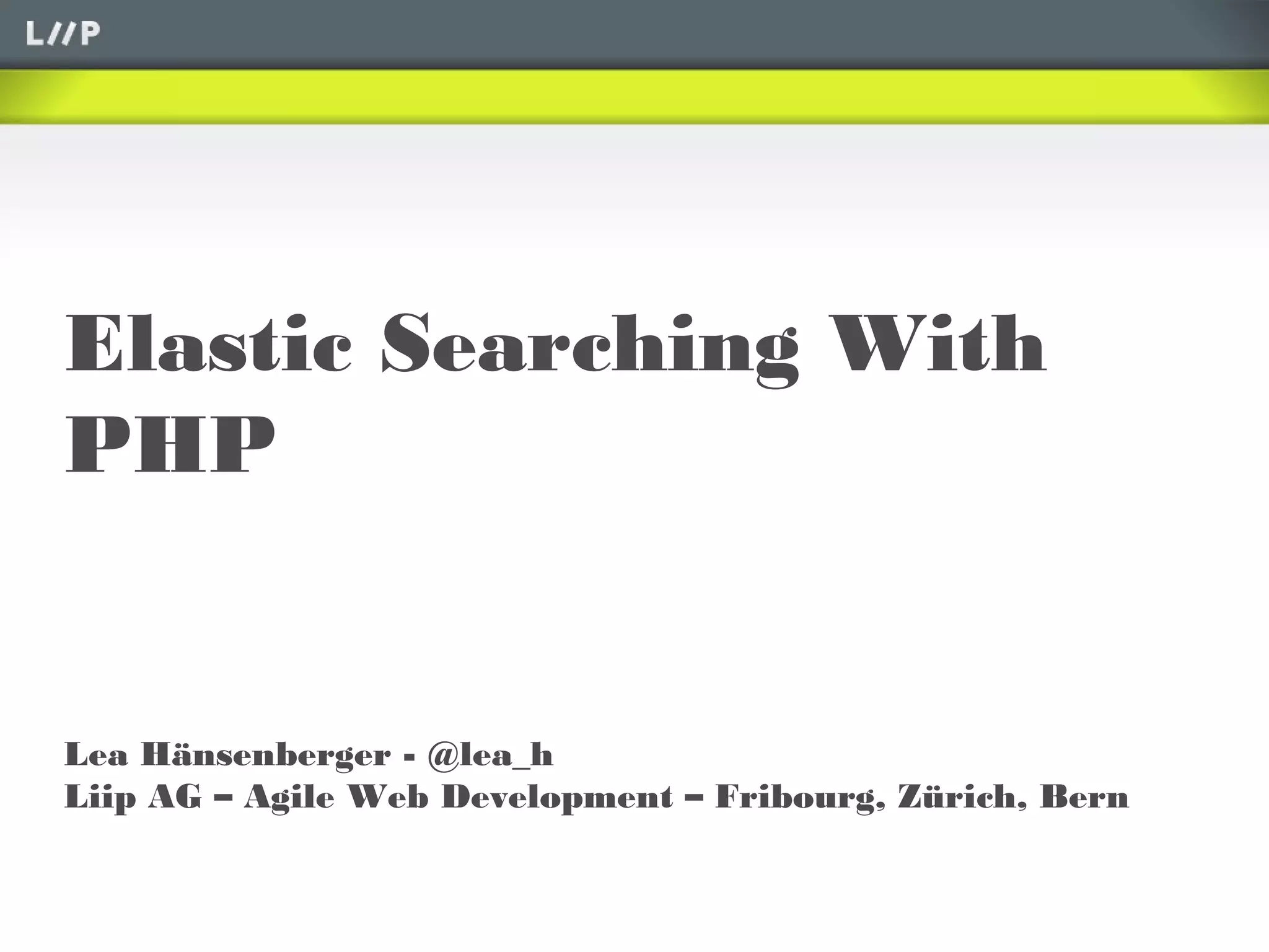 Elasticsearch is a distributed, RESTful search and analytics engine capable of solving a wide variety of problems including full-text search, spatial search, autocomplete suggestions, aggregation, and filtering. The document summarizes how to use Elasticsearch with PHP via two main options - using the Elastica client directly or through the FOSElasticaBundle for Symfony projects, which provides integration with Doctrine, Propel and other ORM/ODM libraries. Key features covered include indexing, searching, filtering documents as well as mapping types and fields.