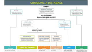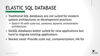 The document discusses the evolution of database architectures, highlighting the limitations of traditional relational databases in modern applications. It proposes Elastic SQL databases as a solution that combines the scalability and availability of NoSQL with the transactional consistency of SQL. Ultimately, it emphasizes the benefits for businesses, architects, and developers in migrating to cloud-based solutions while maintaining reliable data management.