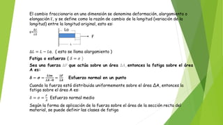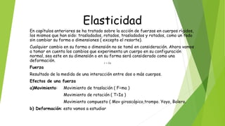 El documento aborda conceptos de elasticidad y deformación en materiales, con un enfoque en diferentes tipos de fatiga y esfuerzo, así como clases de materiales isotrópicos y anisotrópicos. Se presenta la Ley de Hooke, que relaciona esfuerzo y deformación, y se discuten los módulos de elasticidad, incluidos el módulo de Young, volumétrico y de corte. Además, se ilustra cómo se aplican estos conceptos en ejercicios prácticos relacionados con la fuerza y la presión sobre los materiales.