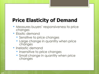 This document provides an overview of price elasticity of demand and supply, detailing how buyers' responsiveness to price changes varies based on elasticity levels (elastic, inelastic, unit elastic). It includes formulas for calculating elasticity, total revenue implications, and determinants such as substitutability and income proportion. Additionally, it discusses applications of different elasticities and how they affect pricing and revenue strategies.