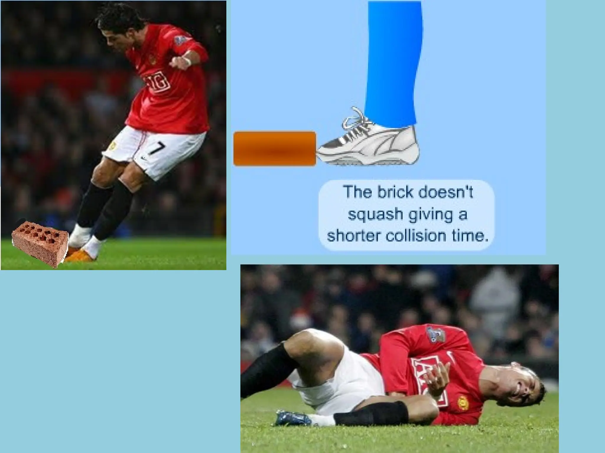 #21 This can be seen very plainly by comparing the effect of kicking a football, which squashes as you kick it giving a big collision time