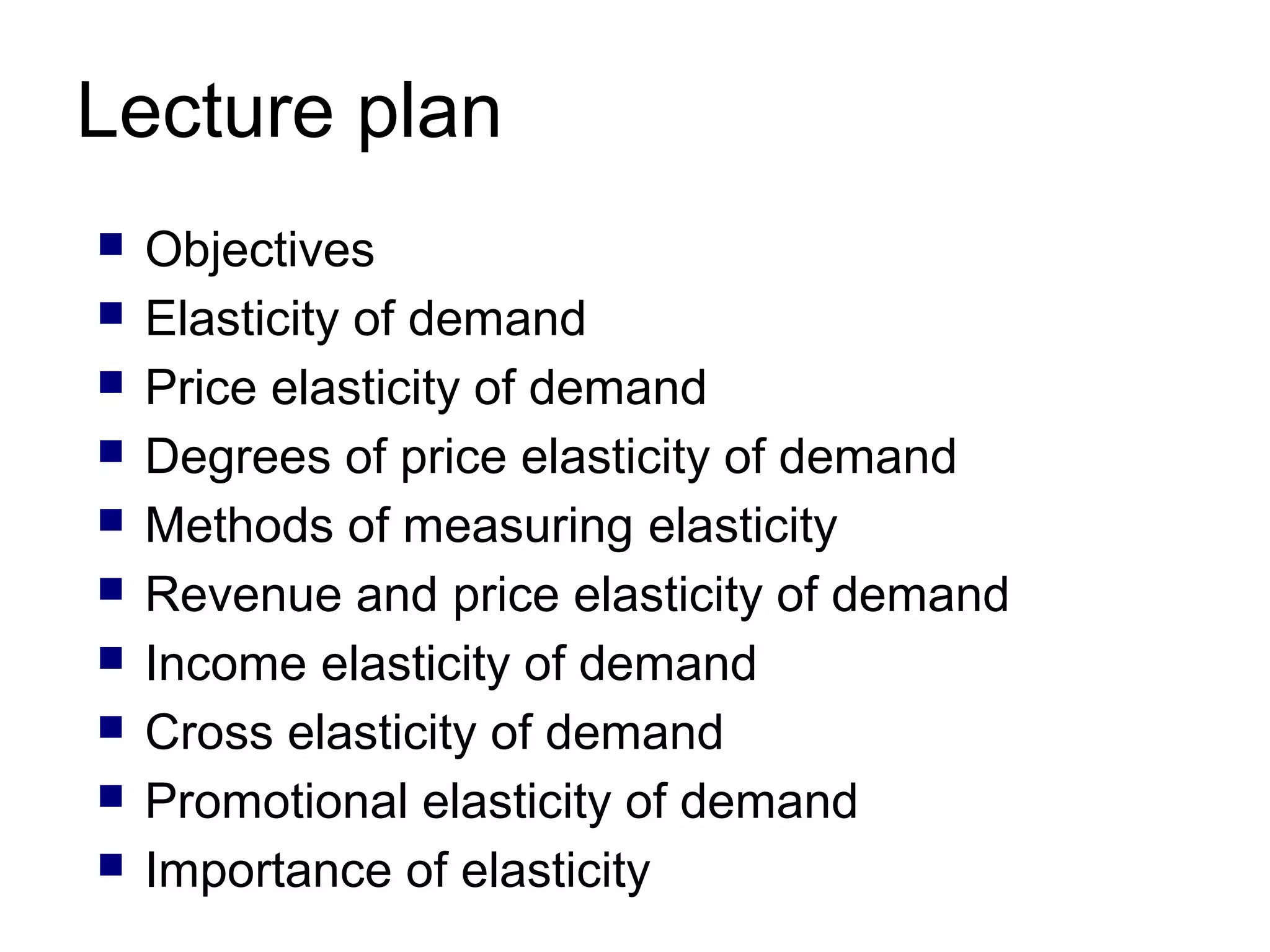 This document discusses elasticity of demand and various types of elasticities. It defines price elasticity of demand as the responsiveness of quantity demanded to a change in price. The percentage method and total outlay method are described for measuring price elasticity. Income elasticity measures the change in demand from a change in consumer income, while cross elasticity reflects the relationship between substitute and complementary goods. The importance of elasticity for determining price, taxation policies, and rewards to production factors is also noted.
