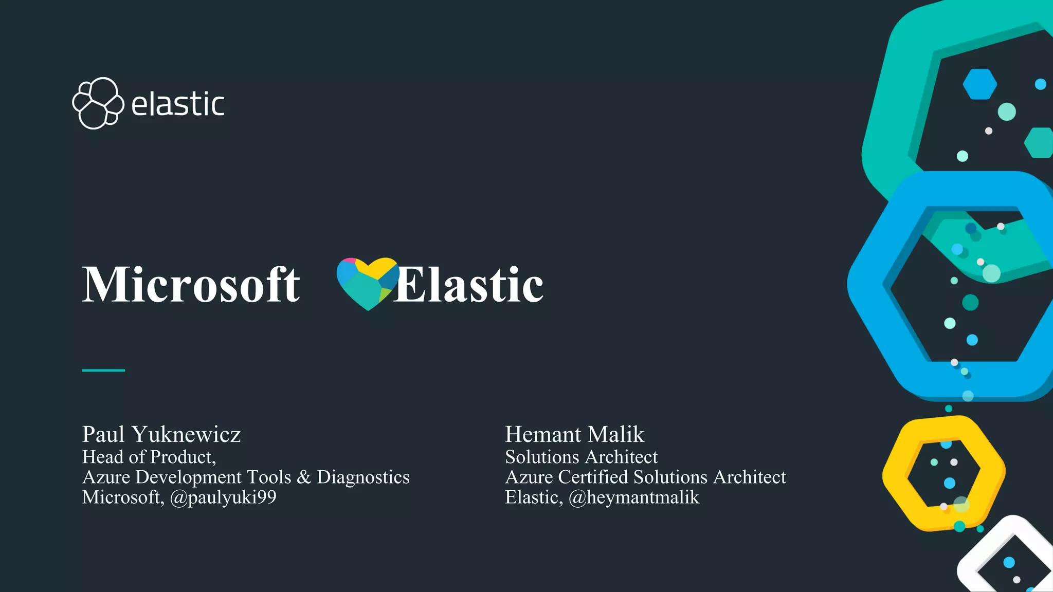 The presentation introduces the partnership between Microsoft and Elastic to offer various Elasticsearch services on Azure, highlighting new regions and integrations. It emphasizes the benefits of flexible service offerings, including managed and self-managed options. The document also includes a forward-looking statement regarding risks associated with the services.