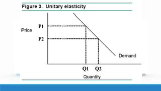 Ang elastisidad ng demand ay sumusukat sa reaksyon ng mga mamimili sa pagbabago ng presyo. Mayroong iba't ibang uri ng elastisidad: elastic demand, unitary elastic demand, inelastic demand, perfectly elastic demand, at perfectly inelastic demand. Ang mga halimbawa at mga batayan para sa bawat uri ay tinalakay, kung saan tumutok sa epekto ng presyo sa dami ng demand ng mga produkto.