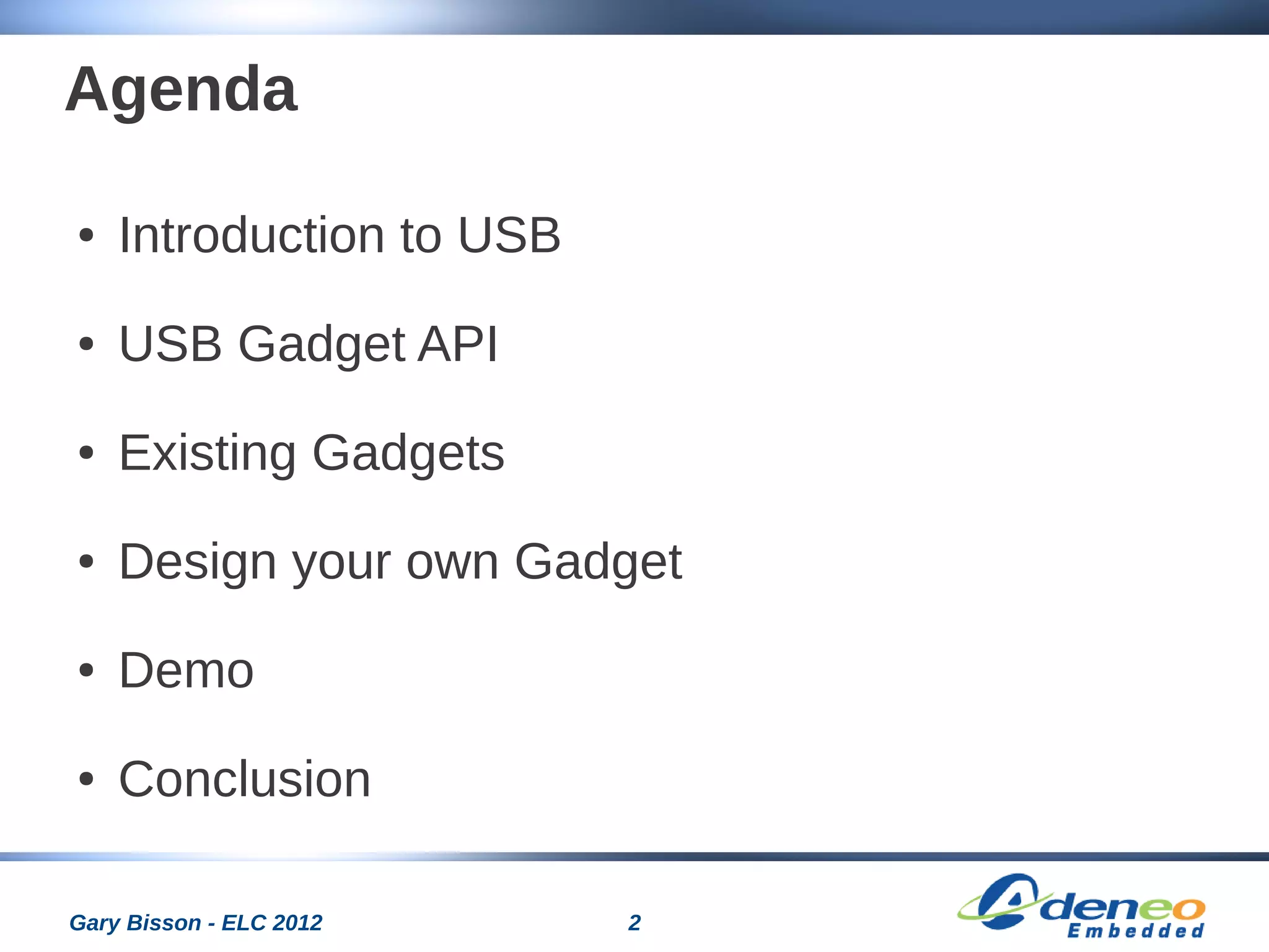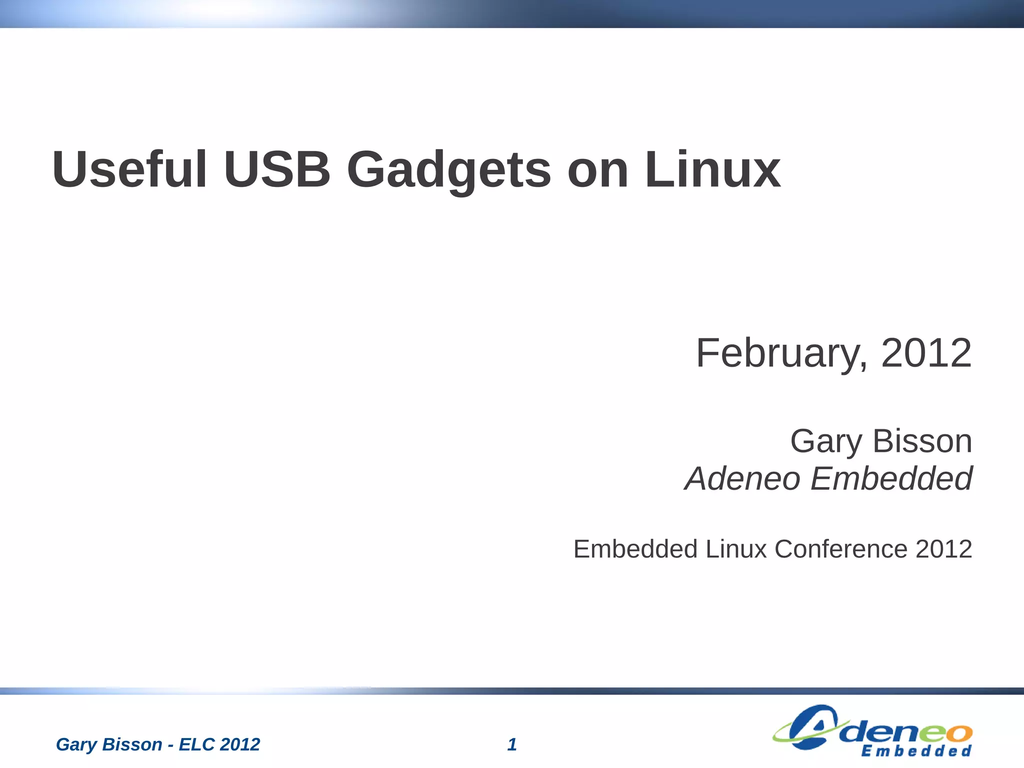 This document discusses USB gadgets on Linux. It begins with an agenda that covers an introduction to USB, the USB gadget API, existing gadgets, designing a custom gadget, and a demo. It then provides details on the USB architecture and standards, the USB gadget API and how it compares to the Linux USB API, examples of existing gadgets like Ethernet and storage, and guidance on designing a custom gadget by implementing driver registration functions and handling control requests and data transfers. It concludes with a demonstration of a USB gadget on a BeagleBoard using U-Boot and a custom Linux kernel and root filesystem configuration.