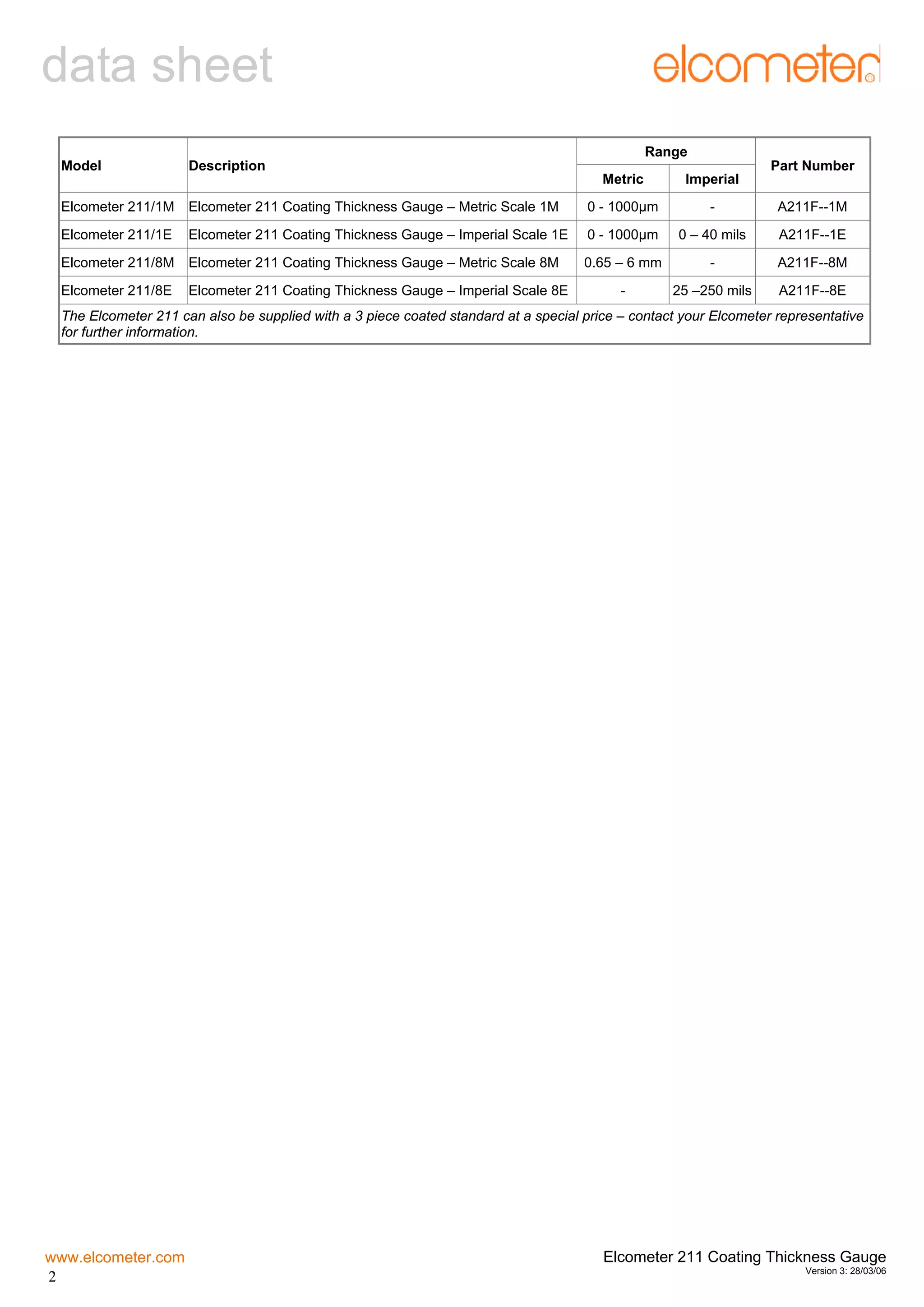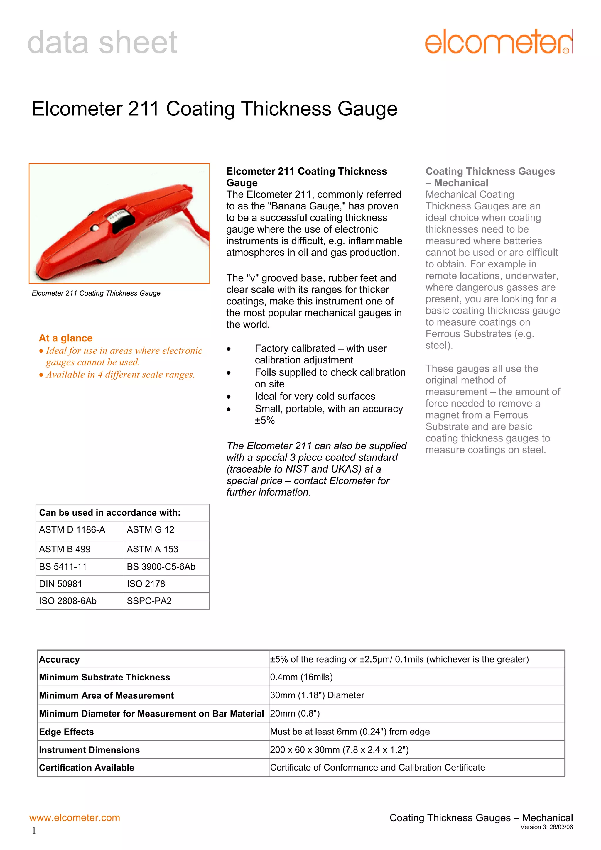 The Elcometer 211 is a mechanical coating thickness gauge ideal for use where electronic gauges cannot be used, such as in inflammable atmospheres. It has a "v" grooved base and clear scale that makes it suitable for measuring thicker coatings. It is portable, accurate to within 5% and can be used on cold surfaces. It is one of the most popular mechanical gauges due to its simple design and wide measurement ranges from 0-1000um or 0.65-6mm.