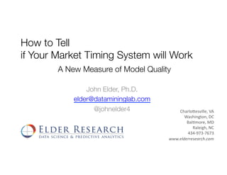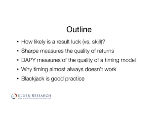 The document discusses various methods for evaluating market timing systems, including the Sharpe ratio, days ahead per year (DAPY), and Modigliani ratio. It notes that while market timing seems appealing, it is very difficult to achieve in practice due to challenges in distinguishing skill from luck, the efficiency of markets, and the psychological impact of losses from failed bets. Blackjack is provided as an analogy for how market timing could work if an investor was able to identify pockets of inefficiency, but that it is difficult to recreate historical market conditions accurately.