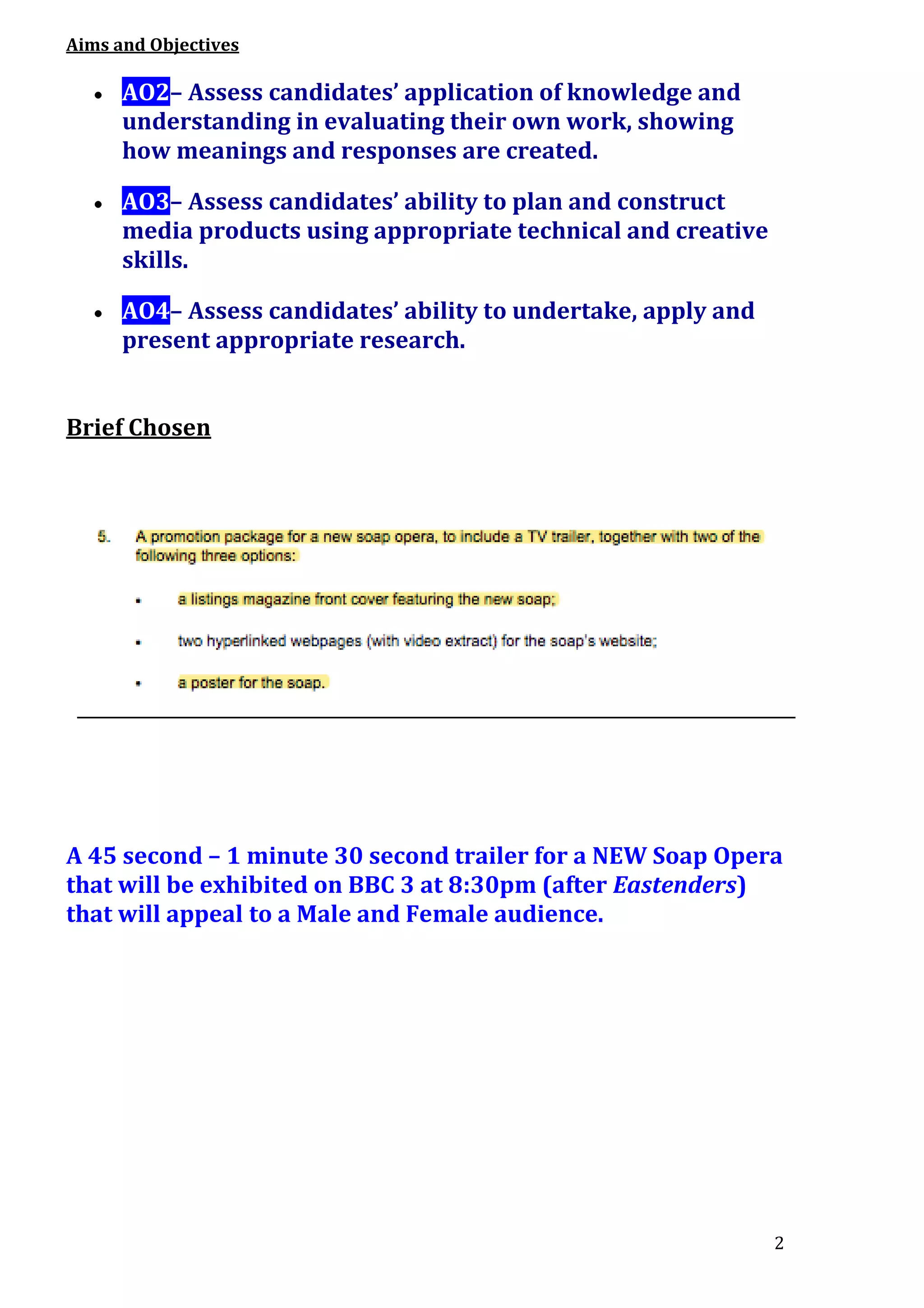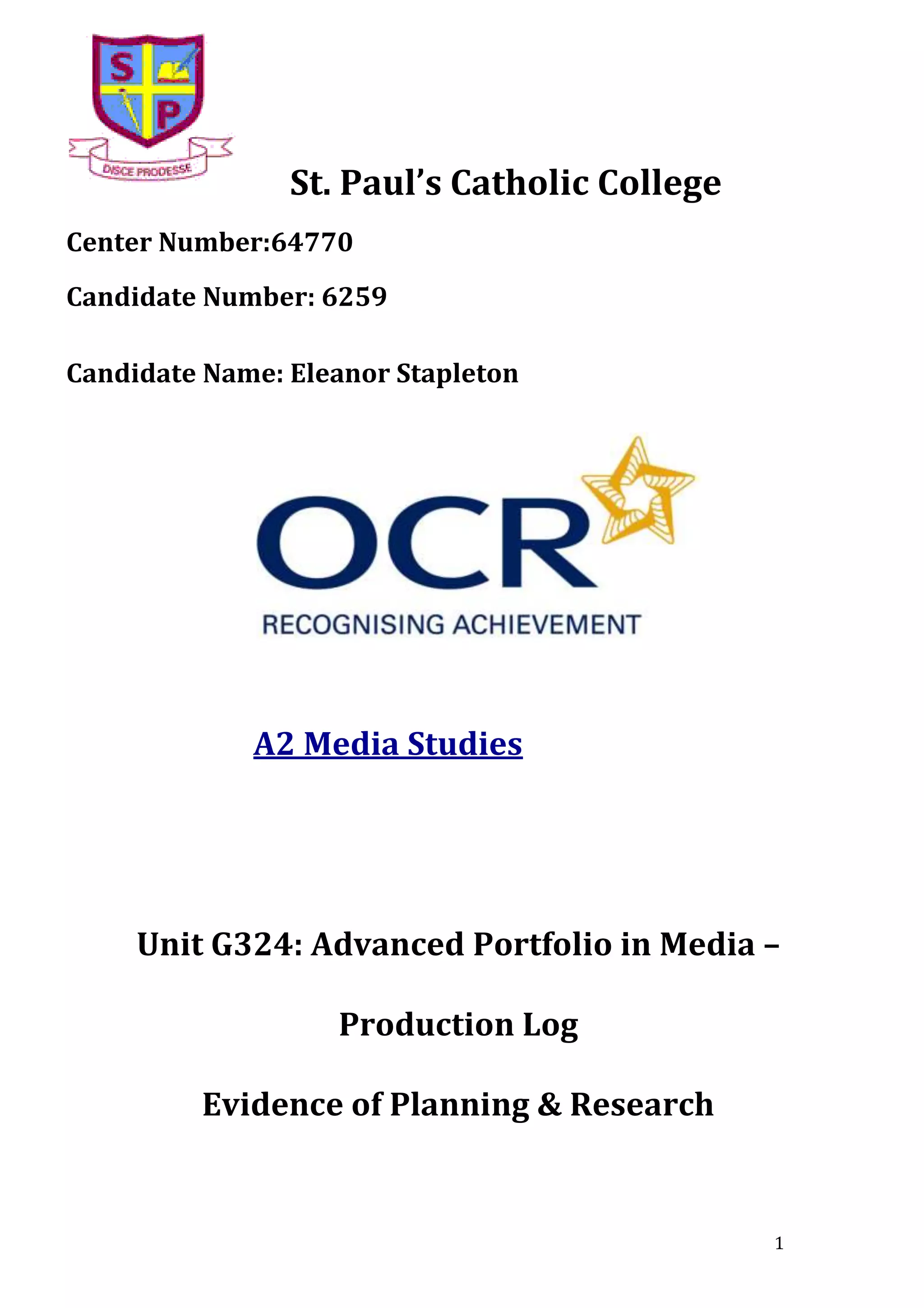 This document provides a production log and research for a student named Eleanor Stapleton completing an A2 Media Studies course. It outlines her plans for an advanced portfolio project involving creating a trailer for a new soap opera. The student analyzes soap opera codes and conventions through examining clips of EastEnders and Coronation Street. Research includes the purpose of trailers, textual analysis of other soap operas, and learning about the roles of a director and producer. Deadlines and plans for filming, editing, posters and other promotional materials are also included. The target channel for the trailer is BBC Three and research on this institution is presented.