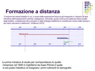 Il documento esplora l'e-learning e la formazione a distanza, evidenziando la loro evoluzione e l'impiego delle tecnologie digitali per facilitare l'apprendimento. Discute l'importanza della comunità di apprendimento e delle interazioni tra studenti e insegnanti, nonché l'uso di strumenti come il computer e Internet per migliorare il processo educativo. Vengono inoltre presentate indicazioni metodologiche per l'insegnamento nelle aule virtuali e l'integrazione di diversi metodi didattici.