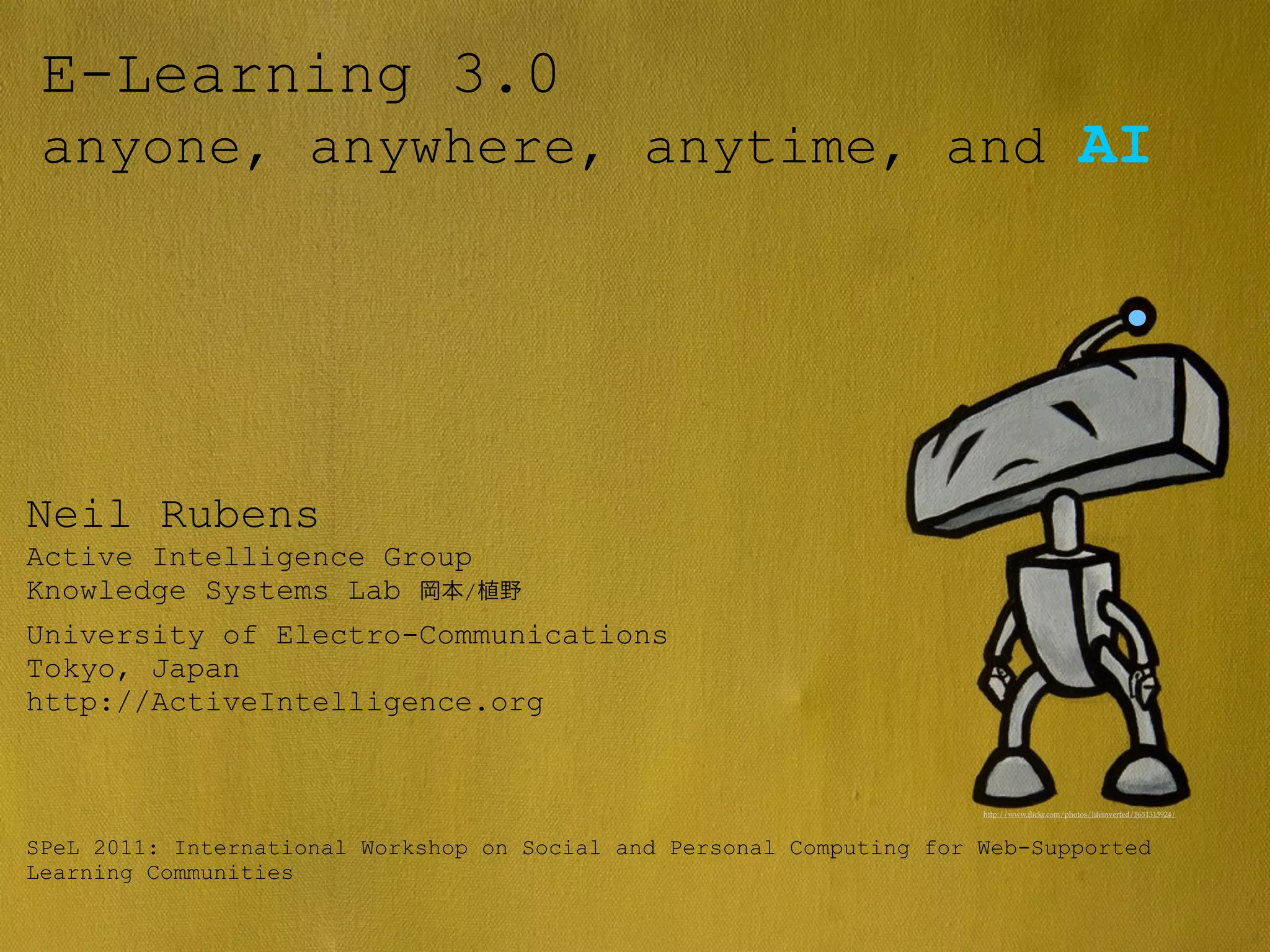 This document discusses the evolution of e-learning and predictions about the future of e-learning, referred to as e-learning 3.0. It begins by reviewing e-learning 1.0 and 2.0, noting how technologies and learning theories have progressed. Predictions for e-learning 3.0 include learning becoming contextual and personalized through intelligent technologies that are integrated everywhere. Challenges with current e-learning models are also discussed, such as information overload and an inefficient knowledge cycle. The document suggests artificial intelligence will play a larger role in e-learning 3.0 by helping address these challenges as data and computing resources increase.