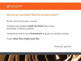 The document discusses the integration of e-learning in literacy teaching, emphasizing the importance of using digital technology to enhance student engagement and understanding. It provides a framework for decision-making in digital content integration, highlighting teaching strategies and exemplar scenarios, such as analyzing war poetry. The session aims to explore the impact of technology on student behavior and literacy while encouraging lifelong learning and critical thinking.