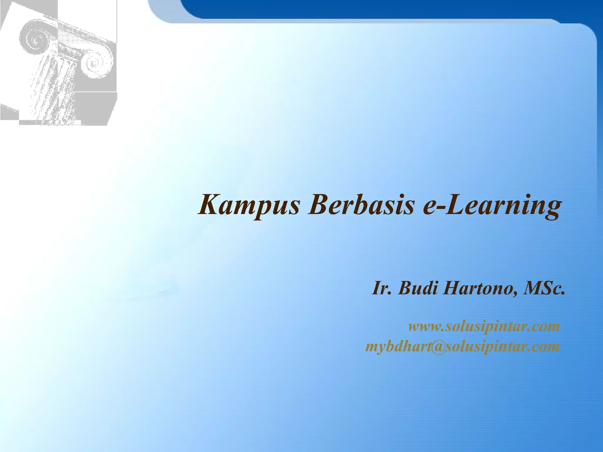 Dokumen tersebut membahas tentang pengembangan kampus berbasis e-learning. Secara ringkas, dokumen menjelaskan bahwa (1) perkembangan teknologi informasi perlu dimanfaatkan untuk meningkatkan proses pembelajaran, (2) e-learning dapat memperkaya metode pembelajaran secara massal melalui internet, dan (3) pengembangan sistem e-learning membutuhkan lingkungan belajar berbasis teknologi seperti learning management system.