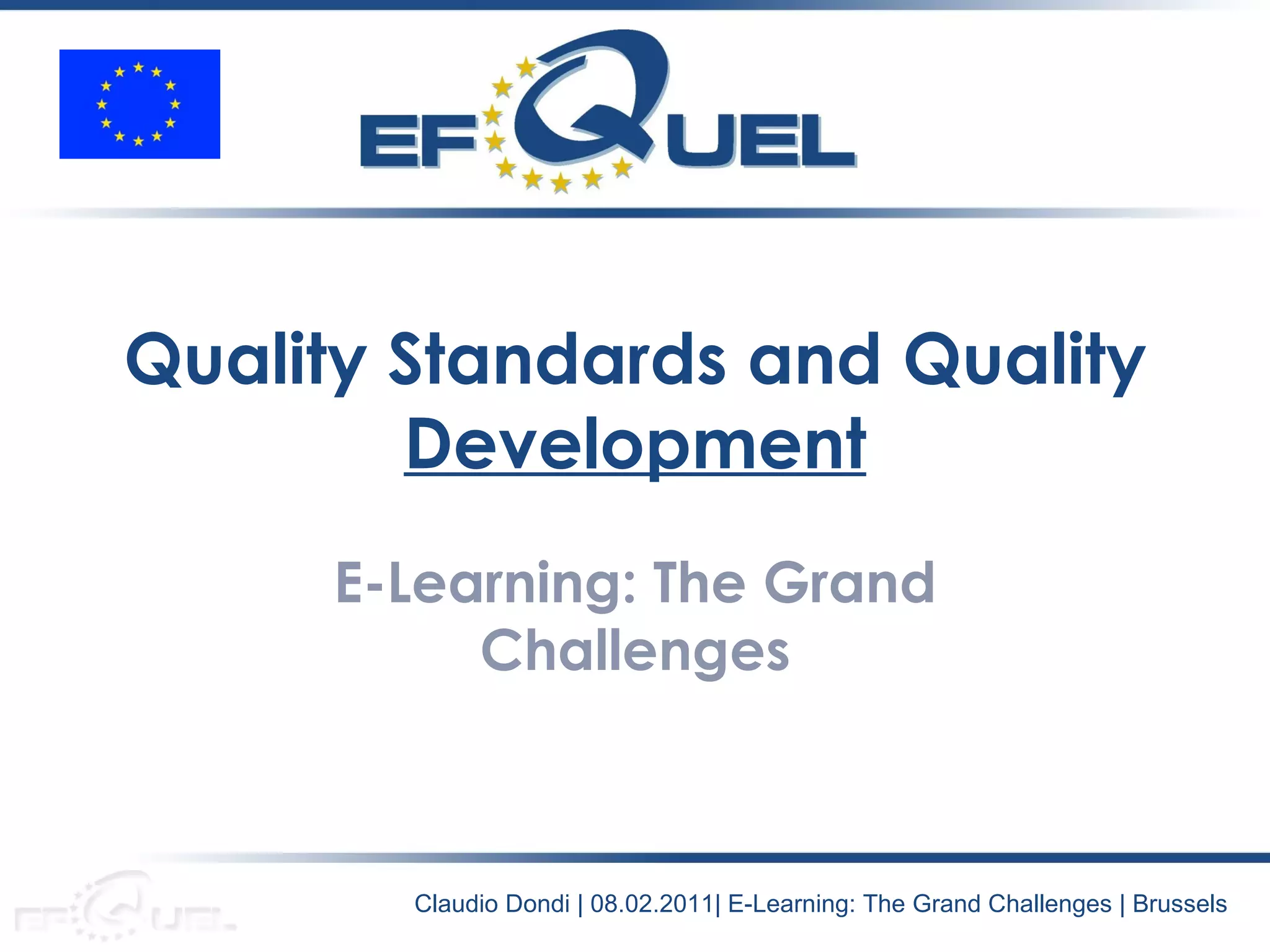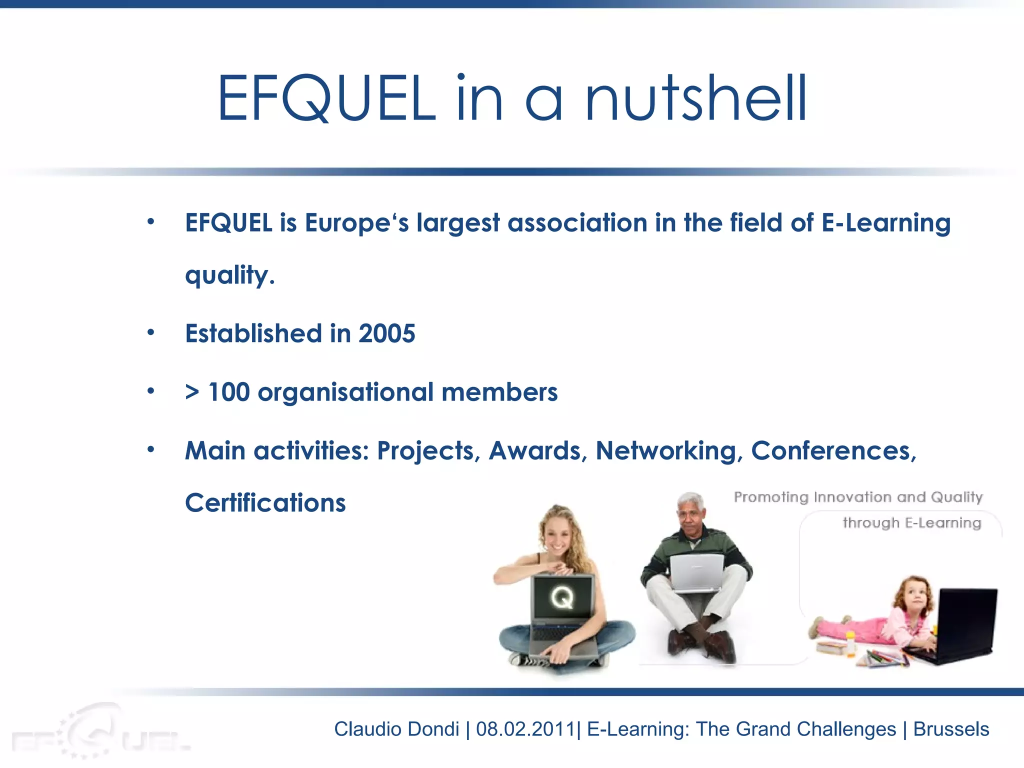 EFQUEL is Europe's largest association focused on e-learning quality, established in 2005 with over 100 organizational members. It works in several areas including projects, awards, networking, conferences, and certifications. The presentation discusses EFQUEL's conceptual framework for evaluating e-learning quality, called SEEQUEL, which includes subjective and objective components. It also introduces the UNIQUe certification for evaluating ICT adoption and integration for learning in higher education.