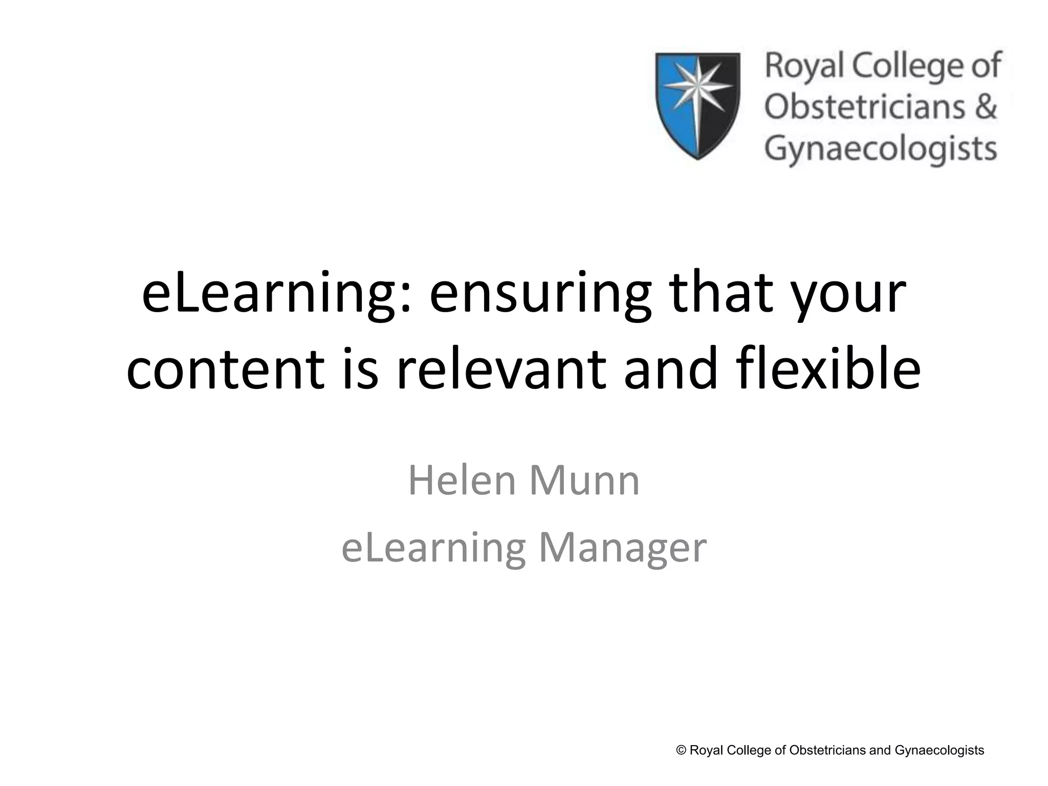 The document discusses the Royal College of Obstetricians and Gynaecologists' (RCOG) approach to e-learning, highlighting the adaptation of content to meet curriculum changes and the needs for blended learning. It covers changes in their business model, transitioning from a commercial product to a membership benefit, and the importance of technology in delivering their educational resources. The RCOG is focusing on making their website more mobile-friendly and exploring the development of a complementary app.