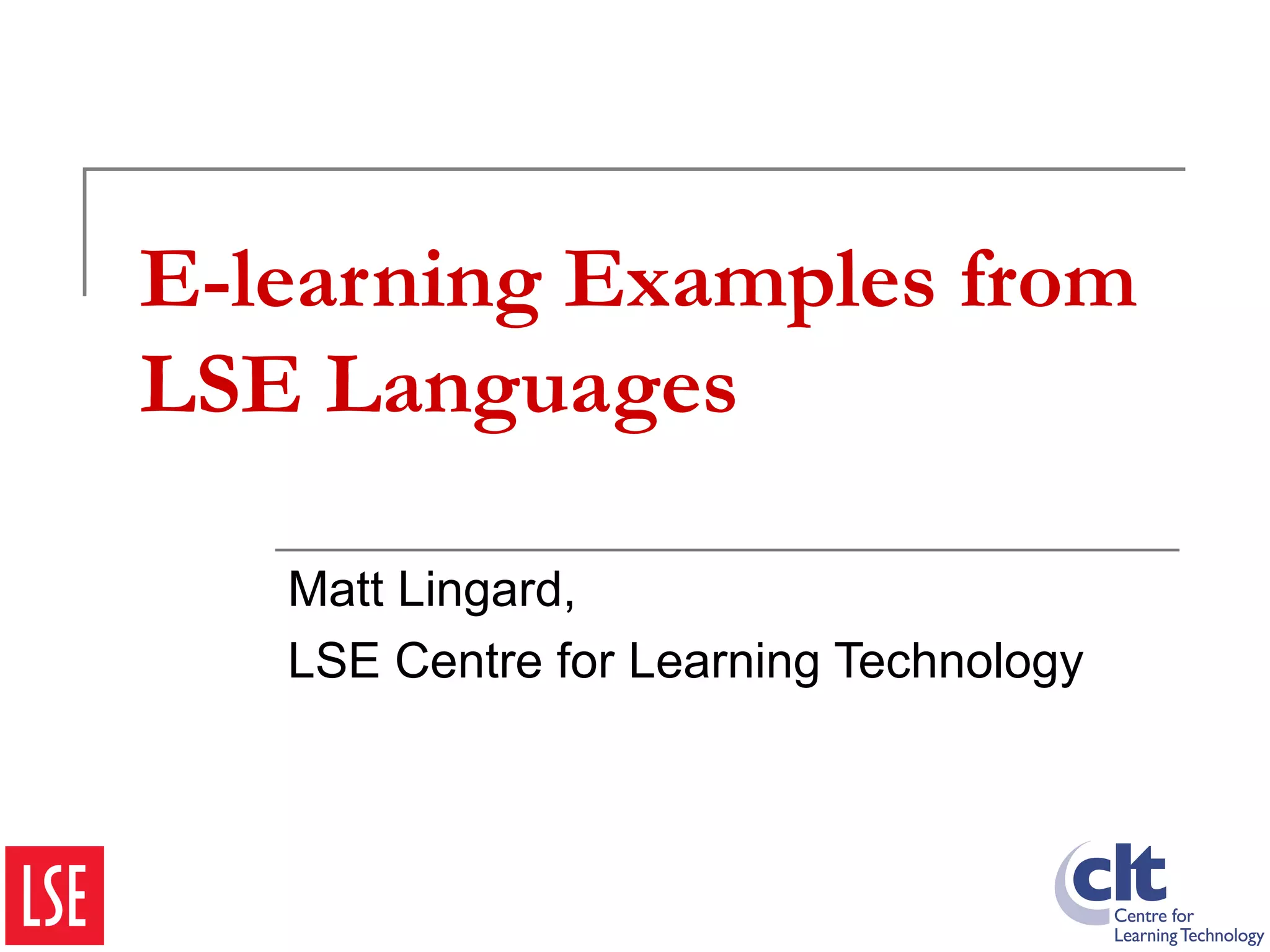 The document outlines various e-learning examples from LSE Languages, focusing on student collaboration and communication methods such as Q&A sessions, commenting, feedback collections, and quizzes. It highlights tools for oral assessments, reading comprehension, and material sharing among teachers. The document also references useful online resources for language learning.