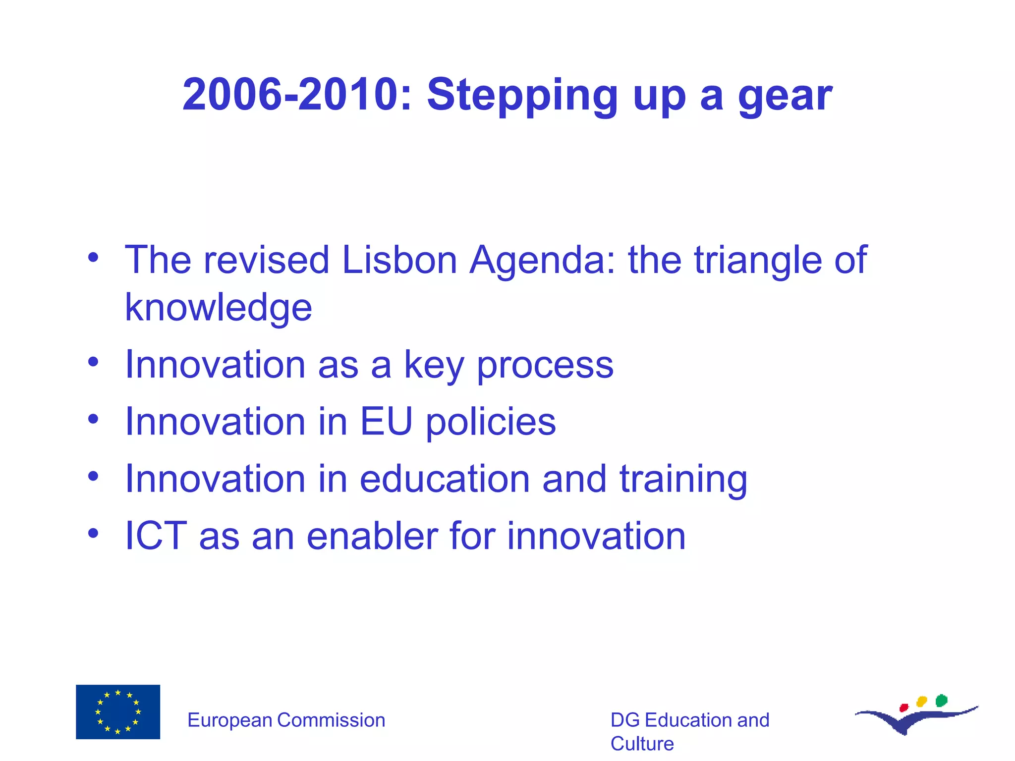 The document discusses innovation in education and training in the European Union from 2006-2010. It outlines several EU programs and funding initiatives totaling over €600 billion that aim to foster innovation through education, research, and regional development. Specifically, it focuses on how information and communication technologies can serve as an enabler of innovation in education systems by promoting collaborative and creative learning, connecting learning communities, and supporting institutional innovation. Lifelong learning is also highlighted as an innovative concept that requires transforming education systems.