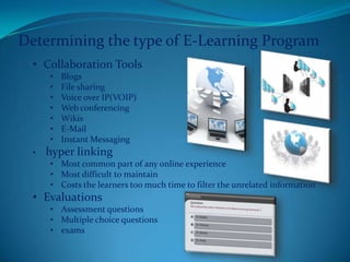 To create an effective e-learning program, an organization needs faculty who are fully qualified to teach online and interested in online instruction, leadership with clear expectations, and ways to engage students in meaningful and collaborative learning through challenges, curiosity and participation. Successful programs utilize technology as a tool for learning, communication and collaboration and use interactive elements like simulations, roleplaying and games to keep students engaged, while evaluations assess student understanding. Program design should not be "cookie-cutter" and consider the nature of online innovation and capturing student attention through various approaches.