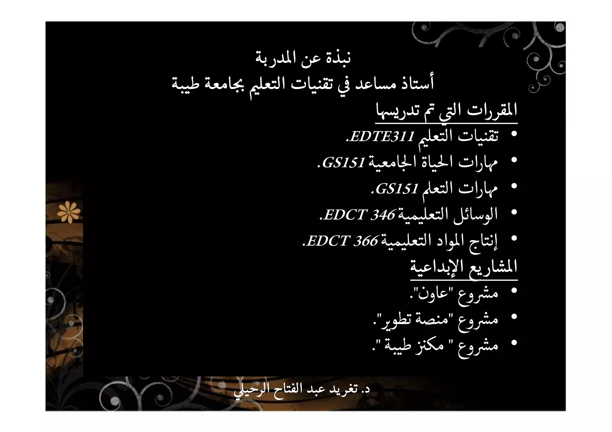تتناول الوثيقة إنجازات وأدوار أكاديمية حول التعليم والتدريب في جامعة طيبة، بما في ذلك التطورات في تقنيات التعلم والتدريس والمشاركة في ورش العمل والدورات التعليمية. تقدم المعلومات عن مساهمات عدد من الأكاديميين في الأبحاث والمشاريع التعليمية. كما تسلط الضوء على استخدام منصات التعليم الإلكتروني والتقنيات الحديثة في العملية التعليمية.