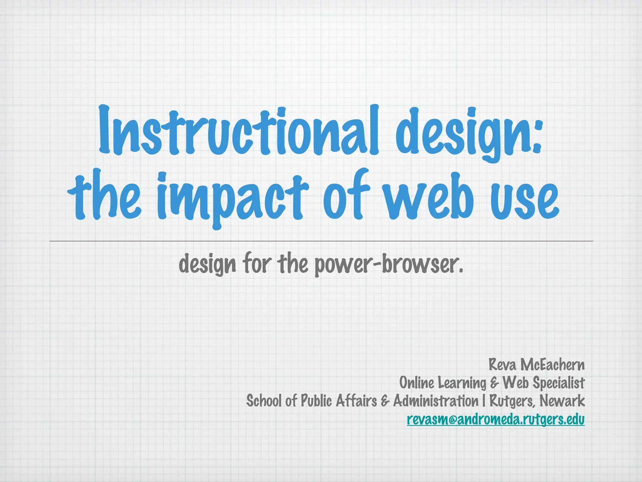 The document discusses how the rise of the internet and digital technologies has changed how people consume and process information. It has led to more scanning and browsing of information rather than deep, linear reading. As a result, instructional design needs to change from linear presentations to designs that support power browsing, such as pulling out key ideas, using multimedia, and creating exploratory learning environments through techniques like anchored instruction and contrasting cases. This will help knowledge integration and meet students where their reading habits are now.