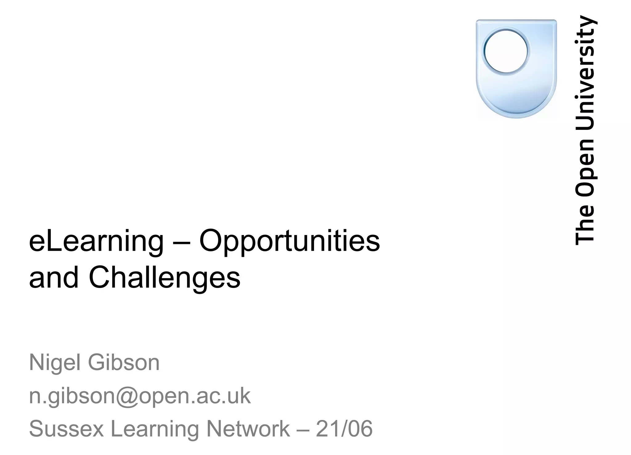 The document discusses opportunities and challenges of eLearning. It maps various issues around online learning provision and supporting learning online. Key points include defining common terms like blended learning; considering a spectrum of online learning approaches from fully online to fully face-to-face; examples of open content initiatives and how they can be used; the importance of connecting learners in various ways online; and how technologies are converging, providing more opportunities for online learning through various devices.