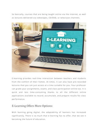 The document compares e-learning and traditional classroom learning, highlighting the rise of e-learning due to its flexibility, cost-effectiveness, and accessibility, especially during the digital revolution and COVID-19 pandemic. It outlines the advantages of e-learning, such as convenience and diverse learning modalities, while also mentioning its limitations, including lack of face-to-face interaction and the need for self-motivation. Conversely, classroom learning is praised for fostering social skills and collaborative learning but criticized for its rigidity and inability to accommodate individual student needs.