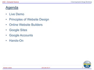 This document outlines an agenda and instructions for a workshop on designing e-learning websites using Google Sites. The agenda includes live demonstrations of example websites, an overview of principles of website design like planning content and audience, a discussion of online website builders with a focus on using Google Sites, creating Google accounts, and a hands-on session to build a website using Google Sites. Attendees will learn how to create pages, add files, edit site layouts, and make announcement pages for news posts. The goal is to help teachers design their own websites to provide online materials to students.