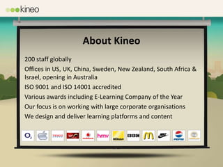 The document discusses trends in e-learning for 2011. It summarizes five key trends: 1) E-learning content is becoming more immersive and visually rich through innovative design approaches. 2) Rapid e-learning tools are coming of age to meet needs for speed, flexibility and ease-of-use. 3) Open source and free e-learning platforms like Moodle are growing in popularity. 4) Mobile learning is a fast growing area utilizing apps, web apps and mobile-optimized content. 5) Collaborative and social learning features are becoming more prevalent in e-learning.