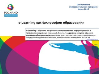 Документ рассматривает философию e-learning как современный метод образования, подкрепленный образовательными технологиями и доступом к учебному контенту через интернет и другие средства. Он подчеркивает растущий интерес к онлайн-обучению среди учащихся и его преимущества, такие как возможность адаптация темпа обучения под себя и доступ к образовательным ресурсам. Также обсуждаются мировые тренды в области e-learning, включая примеры успешных государственных инициатив в различных странах, направленных на интеграцию дистанционного обучения в систему образования.
