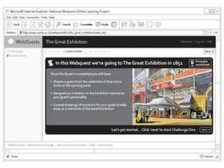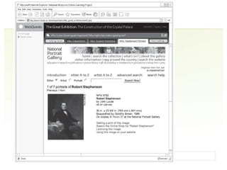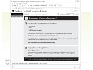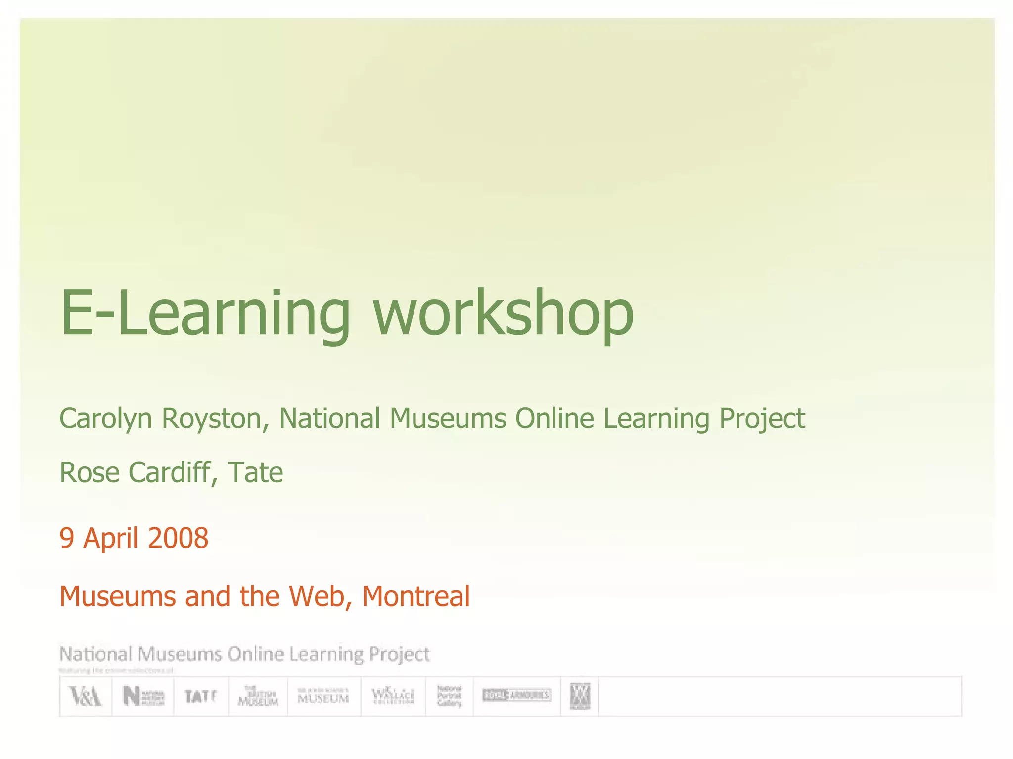 1. The document summarizes a workshop on planning e-learning resources that was run by Carolyn Royston of the National Museums Online Learning Project and Rosie Cardiff of Tate.