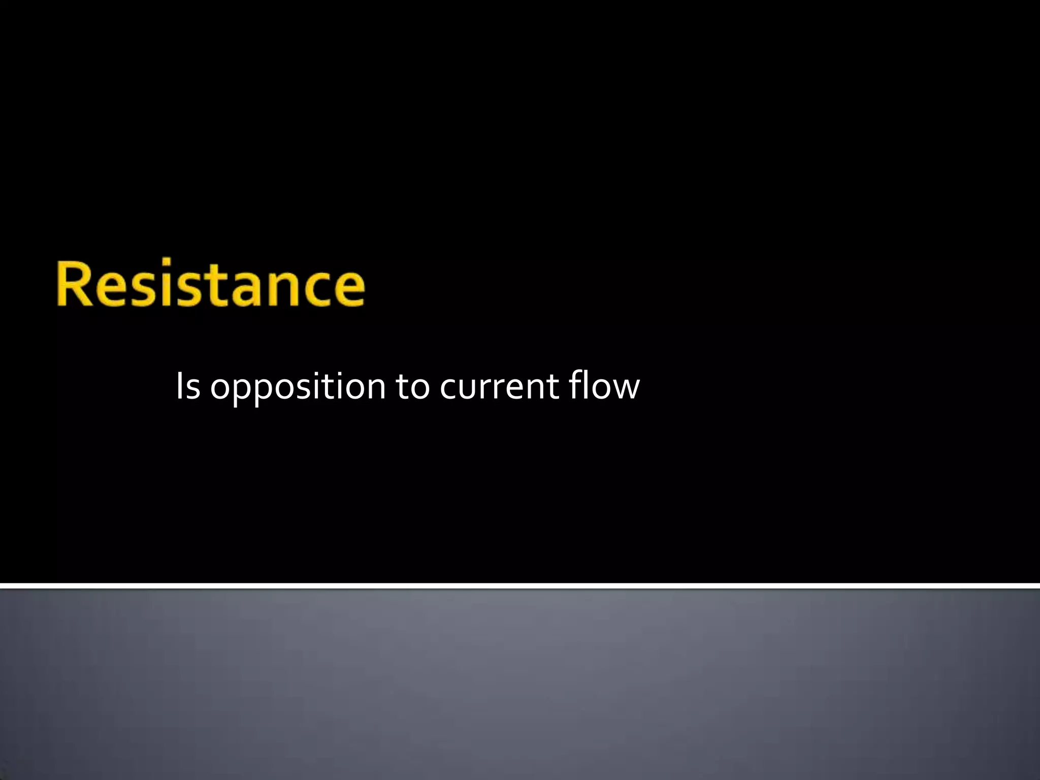 Resistance is the opposition to current flow in a circuit and is measured in ohms. It depends on a material's ability to allow electrons to pass through it, with conductors having low resistance and insulators having high resistance. Conductance is the opposite of resistance and measures a material's ability to allow current flow, with its unit being the siemens. Resistance and conductance are inversely related, as conductance is equal to the reciprocal of resistance.