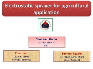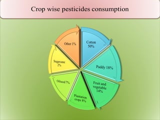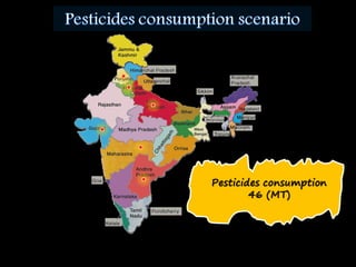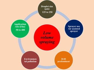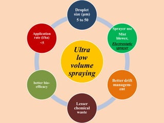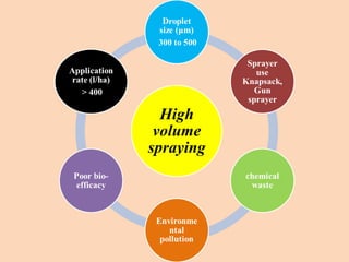 The document discusses the significant crop losses in India amounting to Rs 1,40,000 crores annually due to pests and weeds, encapsulating the advantages and disadvantages of pesticide use. It emphasizes the need for efficient pesticide spraying technologies, particularly electrostatic sprayers, which enhance droplet charge and improve deposition rates on crops while reducing environmental contamination. Various case studies are cited to illustrate the effectiveness of different electrostatic parameters and their impact on maximizing agricultural productivity.