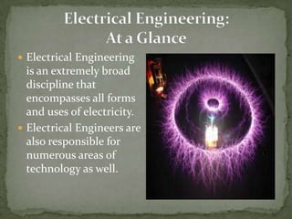 Team #6's project is led by John Sullivan. The team members are ShaMaula, Karl Laguerre, and Chris Pyman. Electrical engineering encompasses all forms and uses of electricity. Electrical engineers are responsible for technology areas like electric motors, communications systems, and power generation. Becoming an electrical engineer requires a strong math and science background in high school, a B.S. in engineering, and certification as an engineer-in-training through examination. Electrical engineers design electrical equipment, test prototypes, and supervise manufacturing. Their day-to-day work involves tasks like design calculations, training, meetings, and lab or field work.