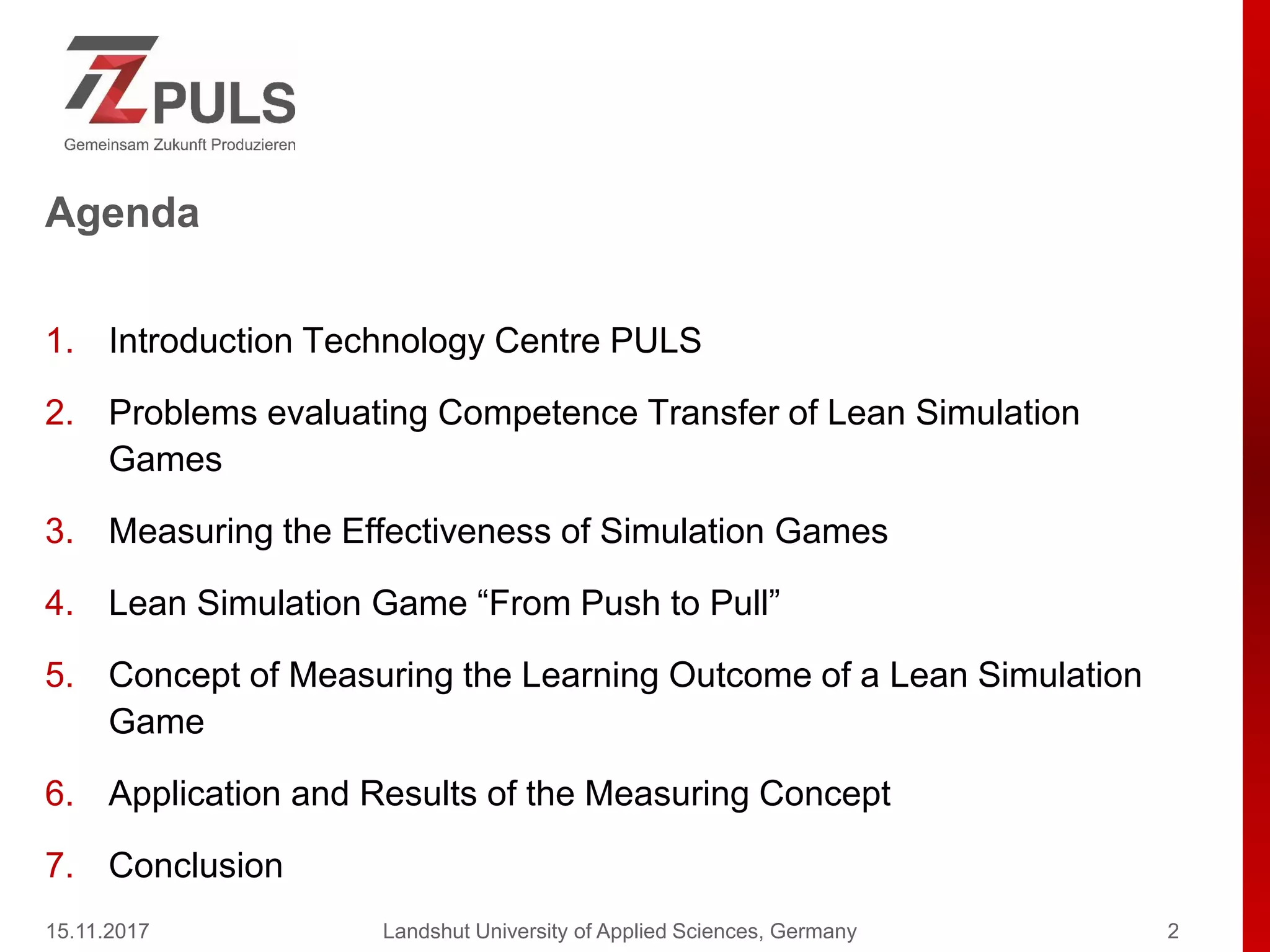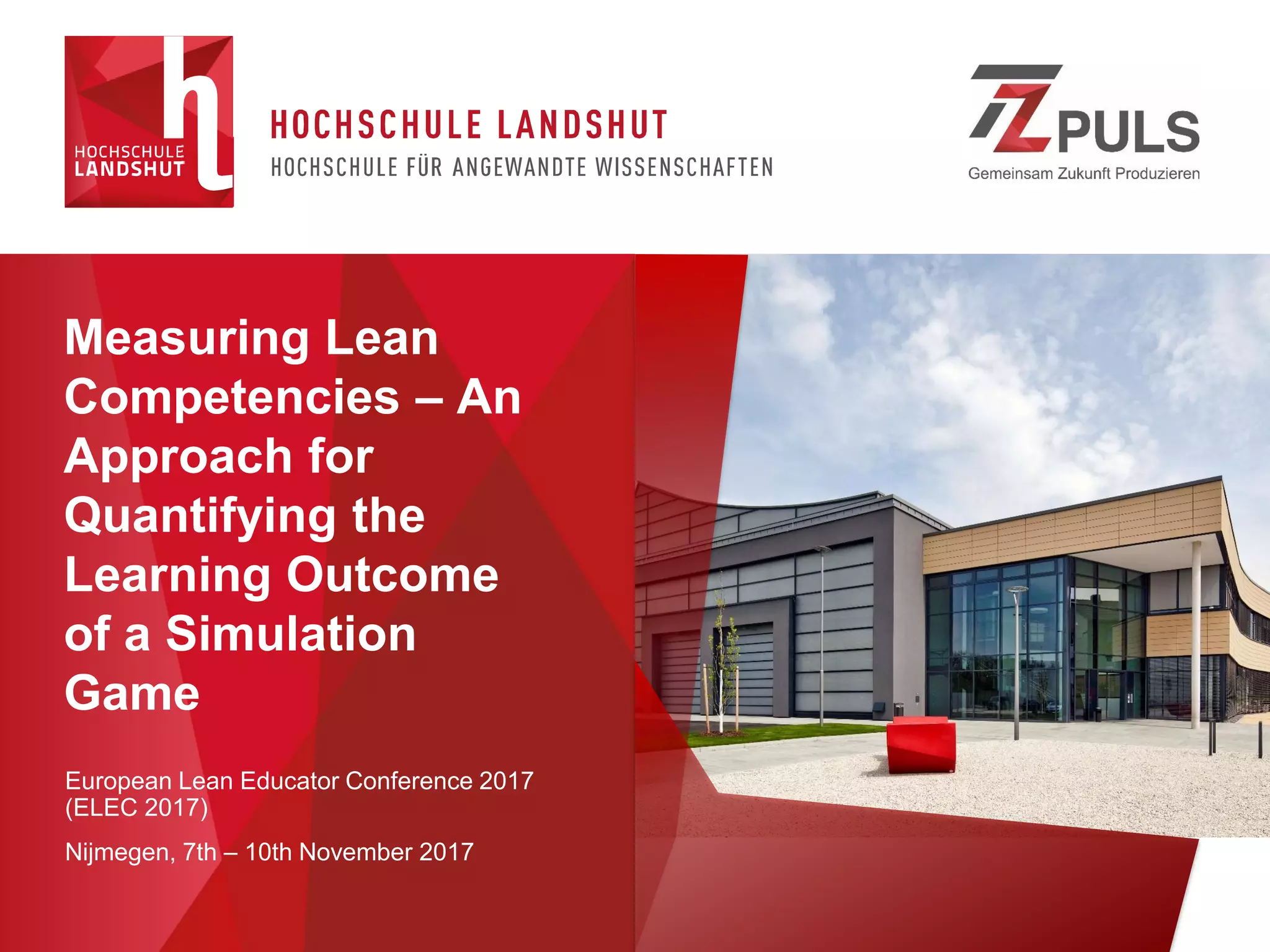 The document describes a study that developed a concept for measuring the learning outcomes of a lean simulation game. The concept involved pre- and post-tests to assess competency development, and interviews to evaluate actions during game play. The simulation game was tested with students to address problems in objectively evaluating competency transfer from such games. Results found an increase in test scores and self-reported competencies, supporting the effectiveness of using simulation games for lean education.