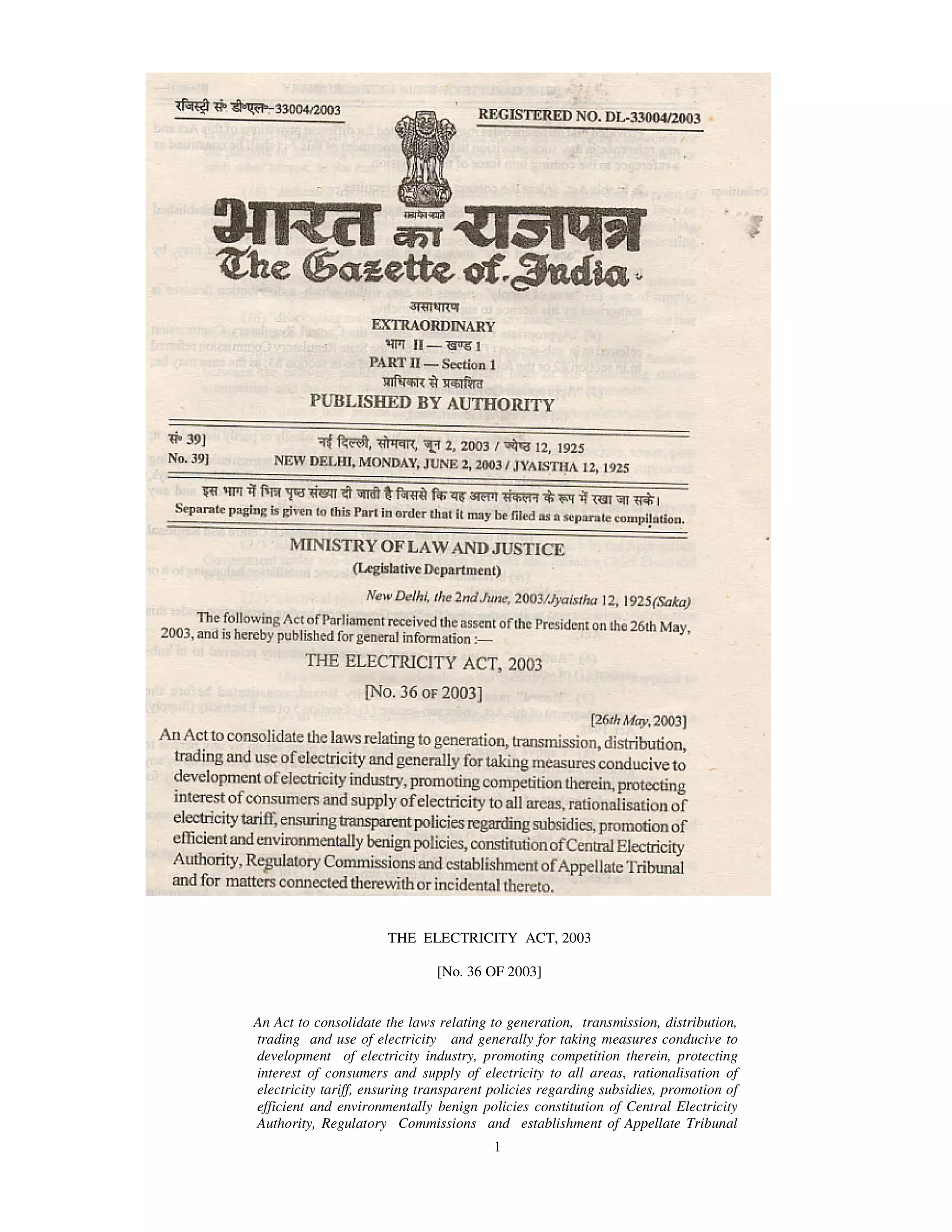 The Electricity Act of 2003 consolidates laws relating to electricity generation, transmission, distribution and use in India. It aims to promote competition and protect consumer interests in the electricity industry. Key aspects covered include establishing the Central Electricity Authority and State Electricity Regulatory Commissions to regulate tariffs and policies, and setting up an Appellate Tribunal to handle disputes. The Act defines important terms related to electricity supply and regulates various areas of the industry including generation, transmission, distribution and trading of power.