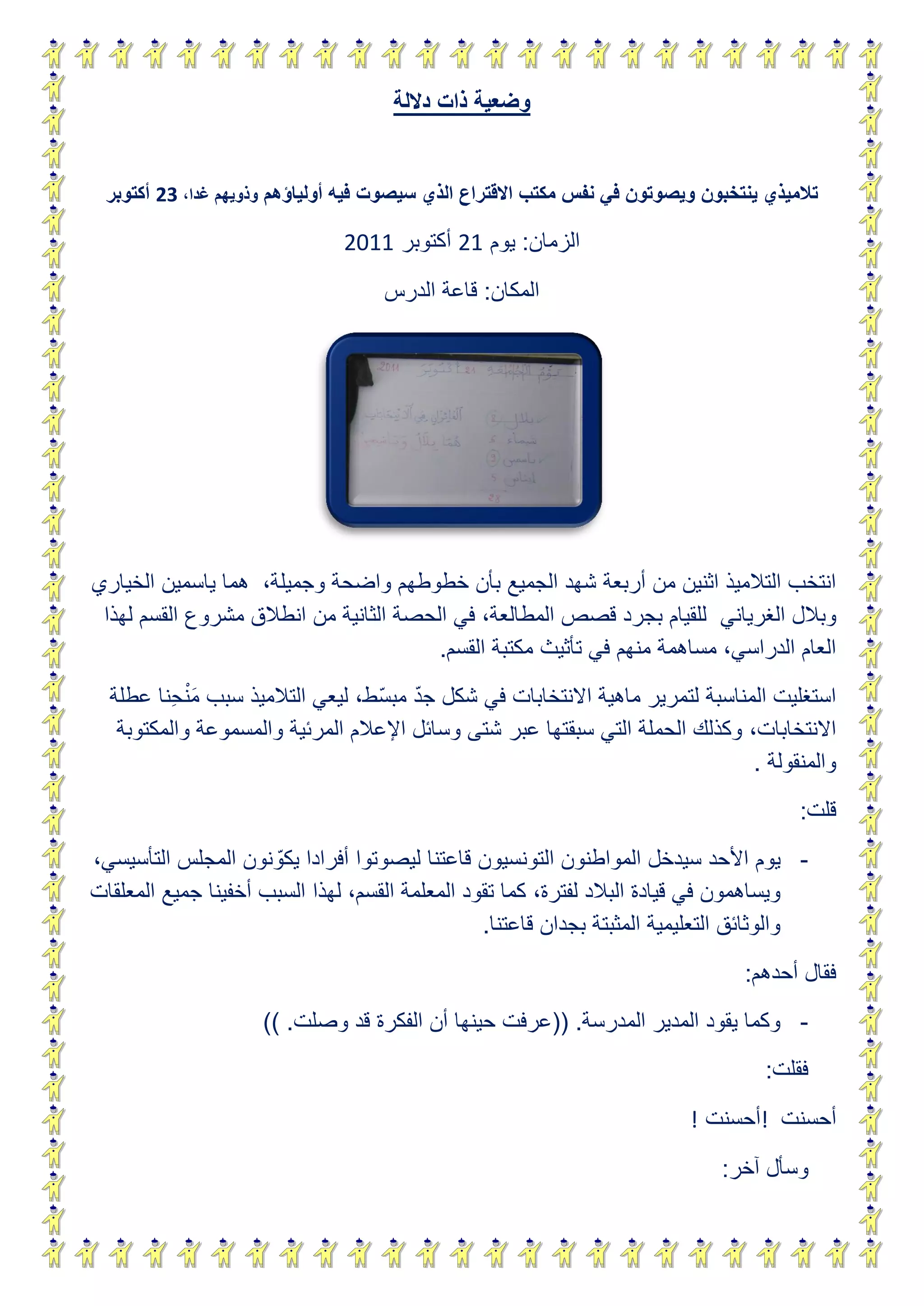 في 23 أكتوبر 2213، قام طلاب الصف بانتخاب وإسقاط أصواتهم لاختيار ممثلين للمشاركة في مشروع تأثيث مكتبة القسم. تم استخدام هذه المناسبة لتعليم الطلاب عن الانتخابات بشكل مبسط، حيث تم الاستعداد لاستقبال المواطنين التونسيين للتصويت لمجلس تأسيسي. ناقش الطلاب حقوق المشاركة في الانتخابات وكيفية قيادتها، مما يظهر فهمهم للموضوع.