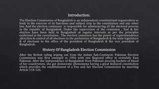 The Bangladesh Election Commission is established by the constitution to oversee elections. It consists of a Chief Election Commissioner and up to four other Commissioners appointed by the President. To be eligible to vote, one must be a Bangladeshi citizen over 18, of sound mind, a resident of the constituency, and not convicted of certain offenses.