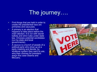 The 2008 US presidential election saw Barack Obama become the first African American president. He won the Democratic nomination over Hillary Clinton after a long primary process involving primaries and caucuses in each state. John McCain won the Republican nomination, selecting Sarah Palin as his running mate. In the general election, Obama won with 365 electoral votes to McCain's 173, taking 53% of the popular vote to 46%. His victory was a historic first and made the 2008 election one that would be remembered forever in history books.