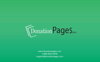 DonationPages.com is a website that provides online fundraising solutions for political campaigns. It offers a patented donation platform that has helped raise tens of millions for over 1500 campaigns. The platform allows campaigns to raise money online, build websites, manage services, and promote via email, text and phone. It has a 5% commission fee on donations plus credit card processing fees, but there are no setup costs. The document provides information on online donor demographics, tactics for acquiring and cultivating donors, and additional services and tools available through the platform.