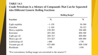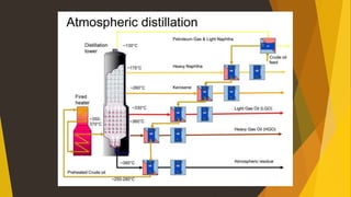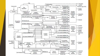 The document discusses petroleum refining processes. It begins with an overview of refining which involves separating petroleum into fractions and treating them to produce marketable products. It then discusses four major forces that have influenced the development of refining processes: demand for products, feedstock supply, environmental regulations, and new technology. Next, it provides historical context starting with early refining focused on kerosene production. It then outlines the main categories of modern refining processes: separation, conversion, and finishing. The document dives deeper into specific separation processes like dewatering/desalting, distillation, and vacuum distillation.