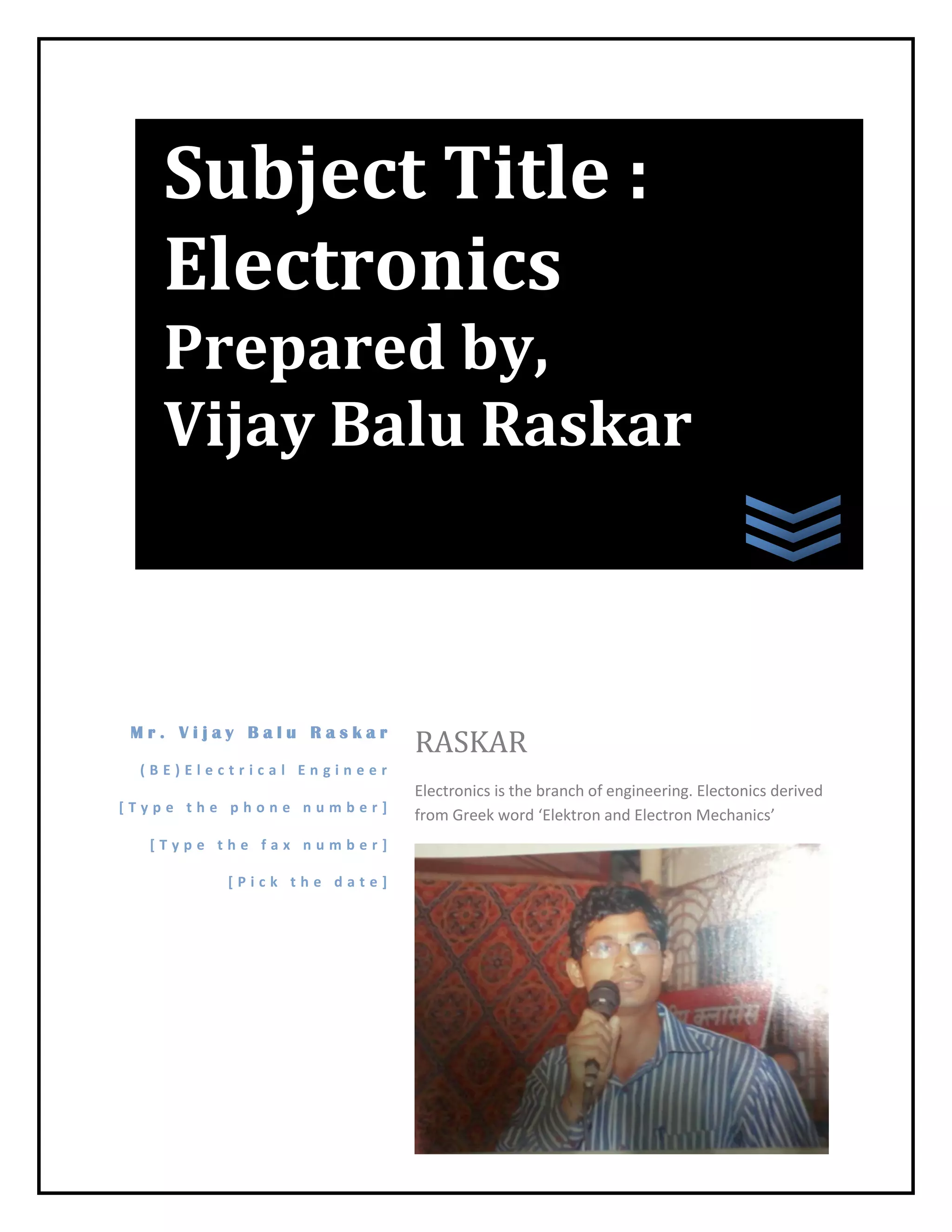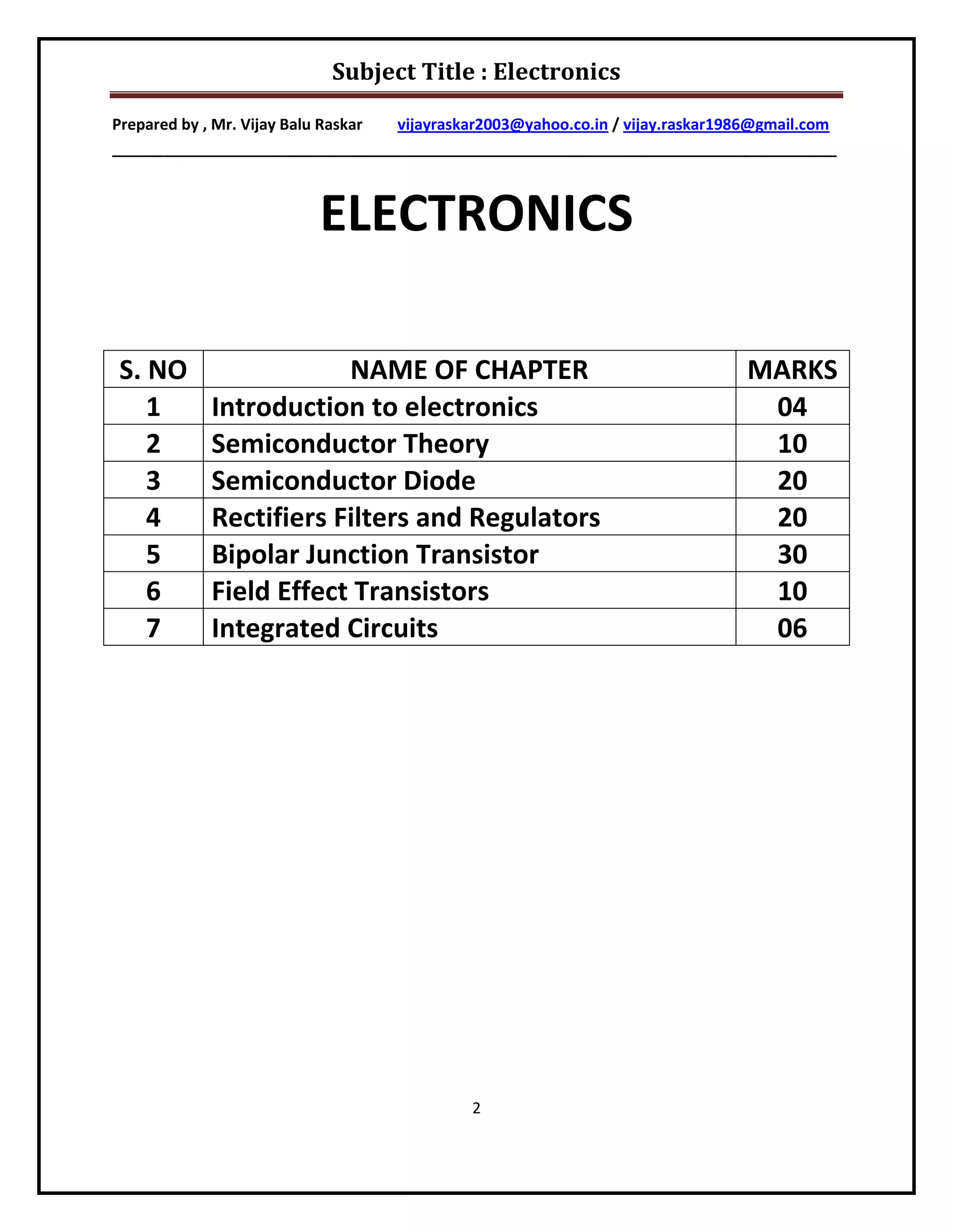 This document discusses electronics and was prepared by Vijay Balu Raskar. It contains 7 chapters on topics in electronics including introduction to electronics, semiconductor theory, semiconductor diodes, rectifiers filters and regulators, bipolar junction transistors, field effect transistors, and integrated circuits. The chapter on semiconductor theory defines semiconductors and discusses intrinsic and extrinsic semiconductors. It explains conduction in intrinsic semiconductors and how doping can increase conductivity in extrinsic semiconductors.
