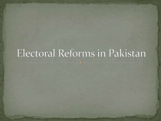 The document discusses electoral reforms in Pakistan. It provides background on elections in Pakistan and outlines several recommendations to improve the electoral process, including establishing clear timelines for nomination procedures, ensuring impartial returning officers and election commission members, allowing overseas voting, using electronic voting machines cautiously, stopping discriminatory voter lists, providing a "none of the above" option, limiting candidates to one constituency, and strengthening monitoring of election expenses and results.