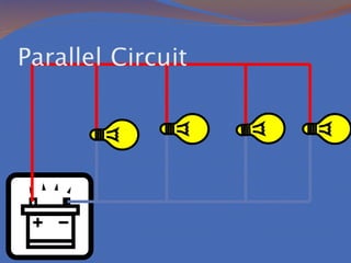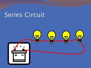 Static electricity refers to the buildup of electric charge on the surface of an object without flowing. It is potential energy that does not move and is stored. Electricity that moves is called current, which is the flow of electrons measured in amperes. There are two types of currents: direct current where electrons flow in one direction and alternating current where electrons flow in both directions. There are also two types of circuits: series circuits where all components are on one path and parallel circuits with multiple branching paths. Conductors allow electric current to flow easily while insulators do not allow current to pass through. Resistance opposes current flow and produces heat, with better conductors having lower resistance. Voltage measures the energy driving current flow with higher