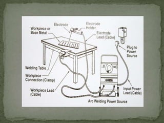 Electric arc welding involves melting metal parts together at points of contact using an electric arc. It can only join parts made of the same metal. The process requires a workpiece, electrode, electrode holder, cables, welding table, and a power source. Welding should not occur below 25°C or above 70% humidity to prevent cracks and rust. Arc welding is important for infrastructure like pipes, vehicles, electricity towers, and tanks. Successful welding depends on selecting the correct welding current and electrode size for the material thickness, as well as proper travel speed, workpiece preparation, electrode angle, and safety equipment like glasses, ear protection, protective clothing, and ventilation.