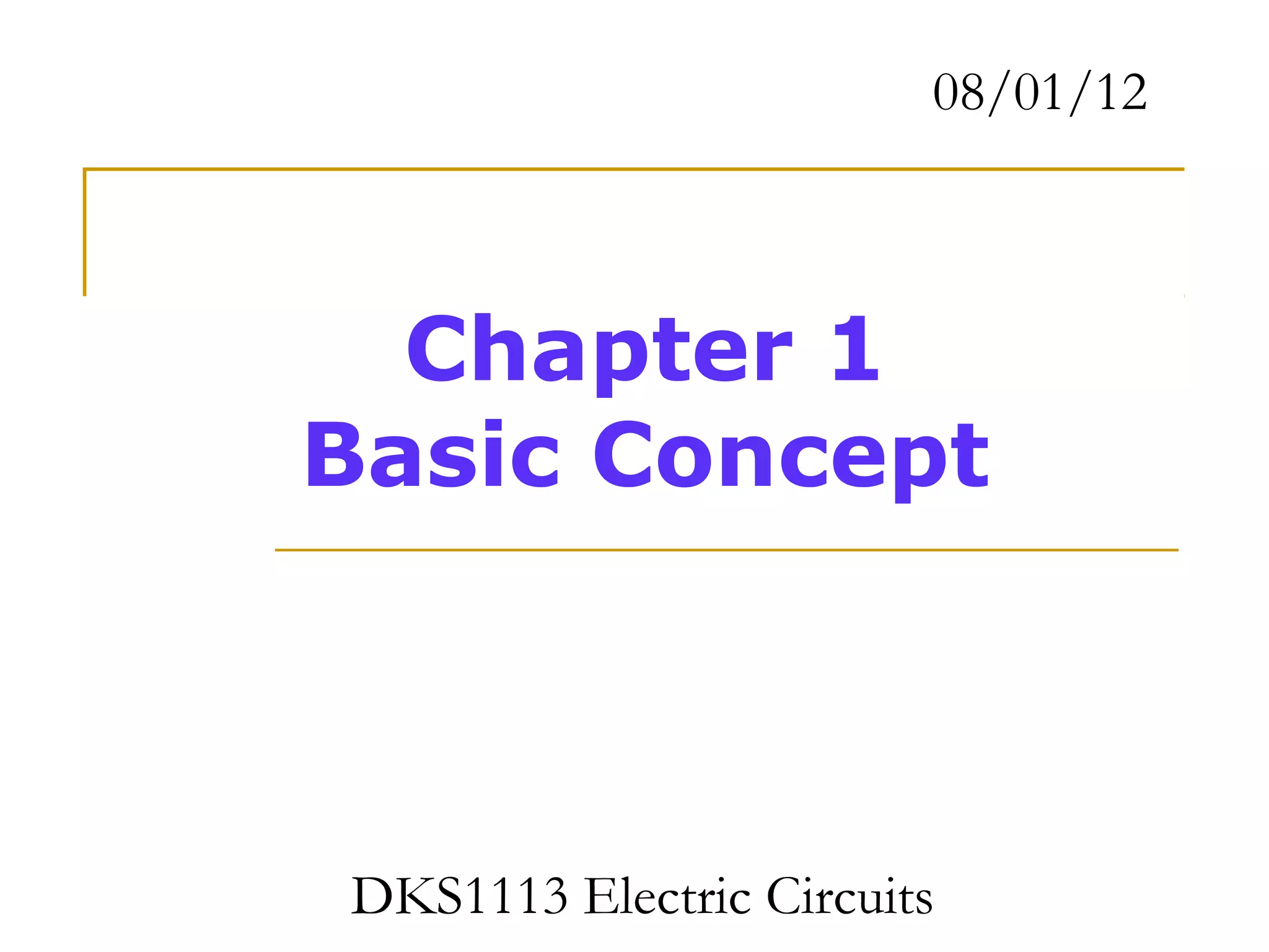 The document introduces basic concepts of electric circuits including charge, current, voltage, power, and circuit elements. It defines each concept, provides examples, and shows calculations for determining values like charge from given quantities of electrons or protons. Key points covered include that charge is measured in Coulombs, current in Amperes, voltage in volts, and power in watts. Circuit elements can be active sources or passive components that absorb energy.
