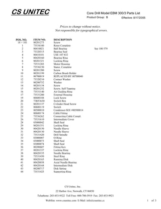 This document is a parts list for a CS UNITEC Core Drill Model EBM 300/3. It contains 100 items with corresponding part numbers, descriptions, and other identifying information. The parts list provides replacement and reference information for components of the EBM 300/3 core drill model.